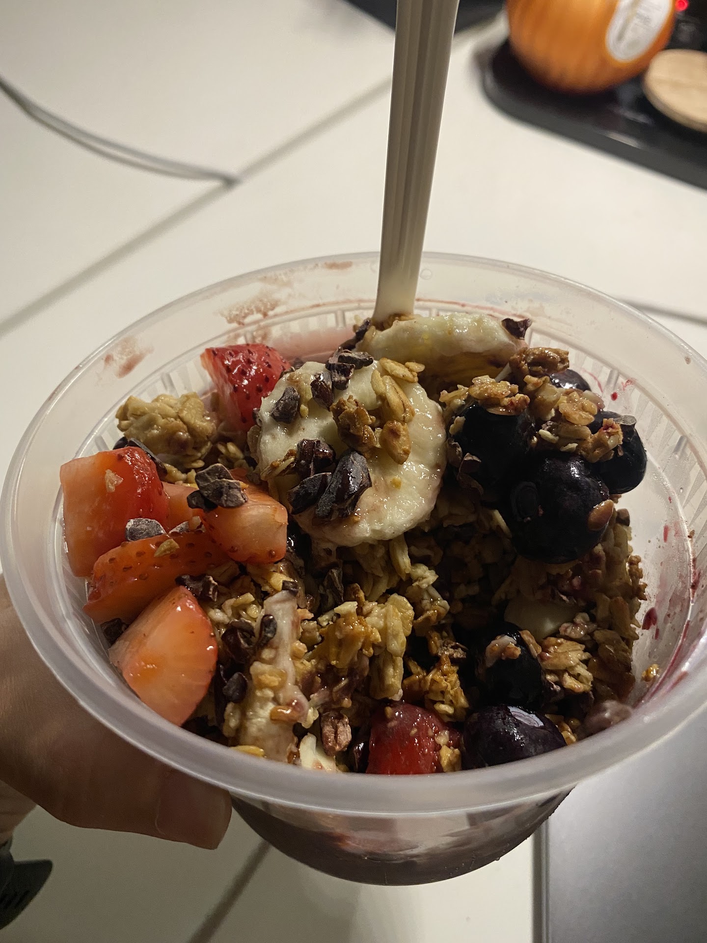 We got a strawberry mix smoothie, a blueberry mix smoothie, and a chocolate chip muffin.