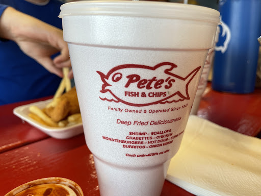 Read moreMy granddaughter, her S O, and I took my son there for his birthday. He had been craving Pete’s Fish & Chips for years he said and never had a chance to get to one. A great little place where you order at the window and pick up your order at the next window. You can eat outside at one of their many bench tables or take your food to go. Even though it was hot as the blazes 🔥🥵we decided to eat there because they have outstanding misters all around their outdoor seating area. Felt so good on a hot day to enjoy the mist that is so cooling. Great idea for establishments that care about their customer’s comfort. Everyone enjoyed their food and me especially because as a side to my cheeseburger, I ordered a large order of onion rings. Off the hook! So very good but sneaky hands kept lifting them off my plate!😱🙀 My son, of course, who still thinks if it’s mine, it’s his too! LOL There was more than enough to share otherwise I would have bit his hand! 🧛♀️ The food was great and I tasted the fish and must admit I enjoyed it. Very fast...