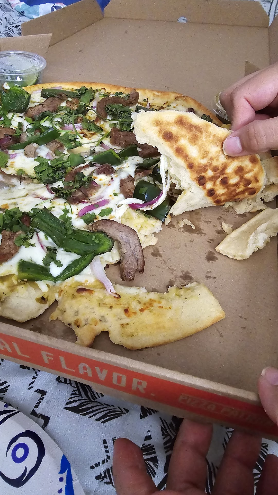 I ordered the Carne Asada Pizza. This is the highlight pizza for this restaurant. When it came out of the oven, they were having trouble removing it from the oven tray to transfer it to the box. It literally came apart in the process.