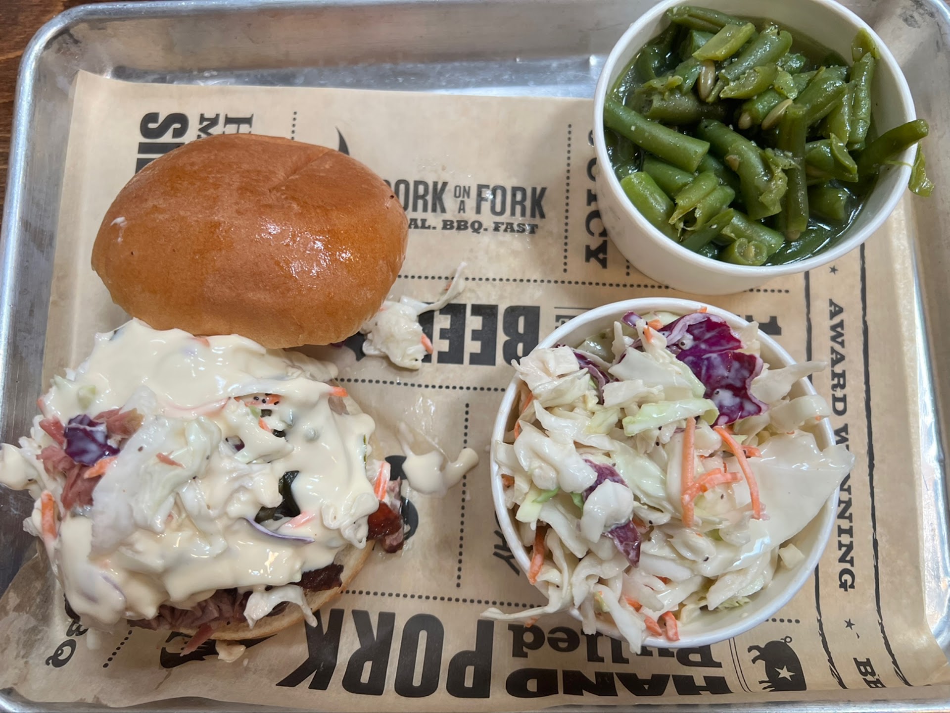 On the hunt for some amazing BBQ today and we hit the jackpot when we walked into Pork on a Fork. If Iād of just been driving by I might of missed this place located amongst an industrial park. Lucky for me I knew where I was headed. Good news for you if you are a passer by they have many signs near the street to hopefully get some customers. Parking lot size is decent and we didnāt have an issue. Once inside we were greeted instantly. I will admit I was a bit taken aback by the guy standing right in front of the entry ready to take an order; not behind a counter, but quite literally at the entrance. There is a good size menu on the wall above to help you choose. My eyes instantly locked on the Midwest Monster sandwich, it included shredded pork and brisket, included coleslaw and jalapeƱos, yes please. They have a regular size or a mini, I chose the mini. It came with two sides so I chose green beans and coleslaw. My husband chose the Big Boy meal which includes all four meats and two sides. He added Mac n cheese and baked beans. We were given a number and told they would bring everything to us. There is a fountain drink station up front then from there there is a hallway that leads you to a good size seating area. This is definitely a happening lunch spot. Everyone was all smiles and seemed to be enjoying themselves. Our food arrived quickly from whoād I assume was either the owner or manager. He was awesome, friendly and we even laughed at his comment about my husband daring to wear a white shirt into a bbq place. (Good news he didnāt spill a thing) . Not only did everything smell divine, but it was all so delicious. I canāt even put my finger on what was our favorite because we loved it all. Iād say front runners were the brisket which was still moist, Smokey flavor and every bite was phenomenal. I love pulled pork sandwiches, but this new take with the monster was what I didnāt know Iāf been missing. The kick from the jalapeƱo and added brisket was amazing. The green beans by far were our fave, followed up by the coleslaw, baked beans then Mac n cheese. All were great, but we found the green beans best. We also noticed a pic with the owner and guy fieri from Diners, Drive in and Dives. The vibe was great, clean place, fast and friendly service and the food was too notch. Weāre already talking about going back and trying so much more! My only regret it I didnāt have any left...