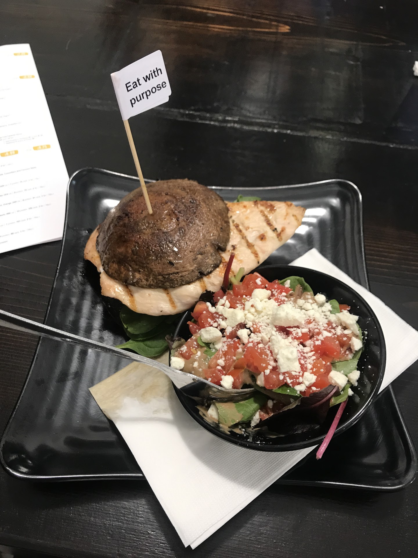 Pictured in my review is a custom bowl of seared salmon (still red/raw in the middle) tofu, quinoa with asparagus, red pepper, carrots, and spinach, and then the sweet siracha and teriyaki sauce together. It's super good.
