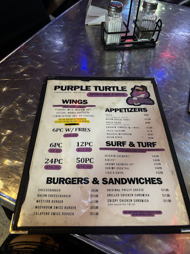 Read moreI will start off by saying that the food is AMAZING! I love the hot wings and their fries. The food is the only reason why I go back to this place, if the food was bad then Iâd never step foot into the Purple Turtle again. The problems with this place mainly, is that when you seat yourself, it takes absolutely forever to get the attention of a waiter (like 15-30 minutes), and Iâve been here during the early afternoon on a weekday when virtually no one else was there. After you order your food, itâs takes even longer for you to get it, I always order wings and fries and that takes over 40 minutes to get to my table. Once again, wings and fries are pretty easy and fast to make, and thereâs no other orders. When you get the food, itâs amazing, itâs hot and fresh, so delicious. But again, itâll be impossible to get a waiterâs attention so good luck trying to get a refill or napkins. If it wasnât due to the good food, I wouldnât come here anymore but I love the food!