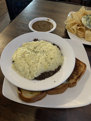 Drinks were crisp and cold ! Tasted clean and great surprised ! Spinach artichoke dip was lukewarm and chips very salty little breads were very buttery and soft and a bit warm overall alright had better still enjoyed it , shepherds pie doesn’t have gravy in it was told as I wanted the gravy to the side instead of mixed in but it’s so rich and thick in meat juice and spice that it’s moist without it but I recommend getting a side of gravy makes it way better the mashed potatoes a bit clumpy throughout and a tad bit salty, it...