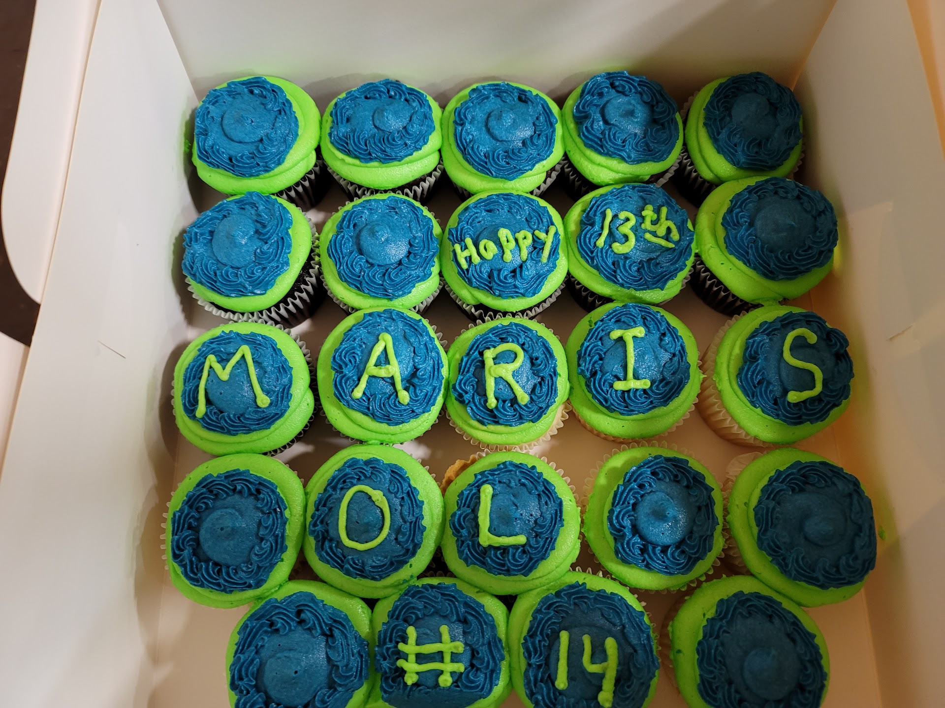 I was presented with two boxes of stunningly decorated cupcakes that matched my outfit precisely! She matched the colors to a pantone precision, and included other personalization.