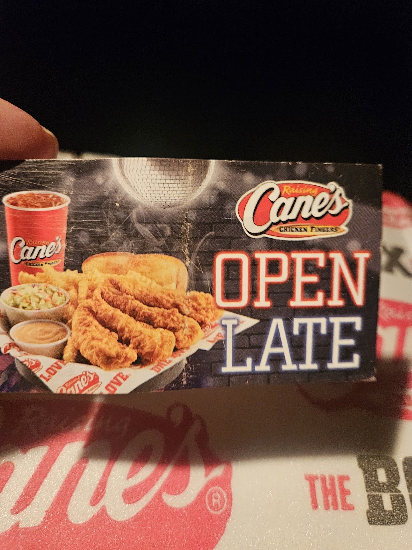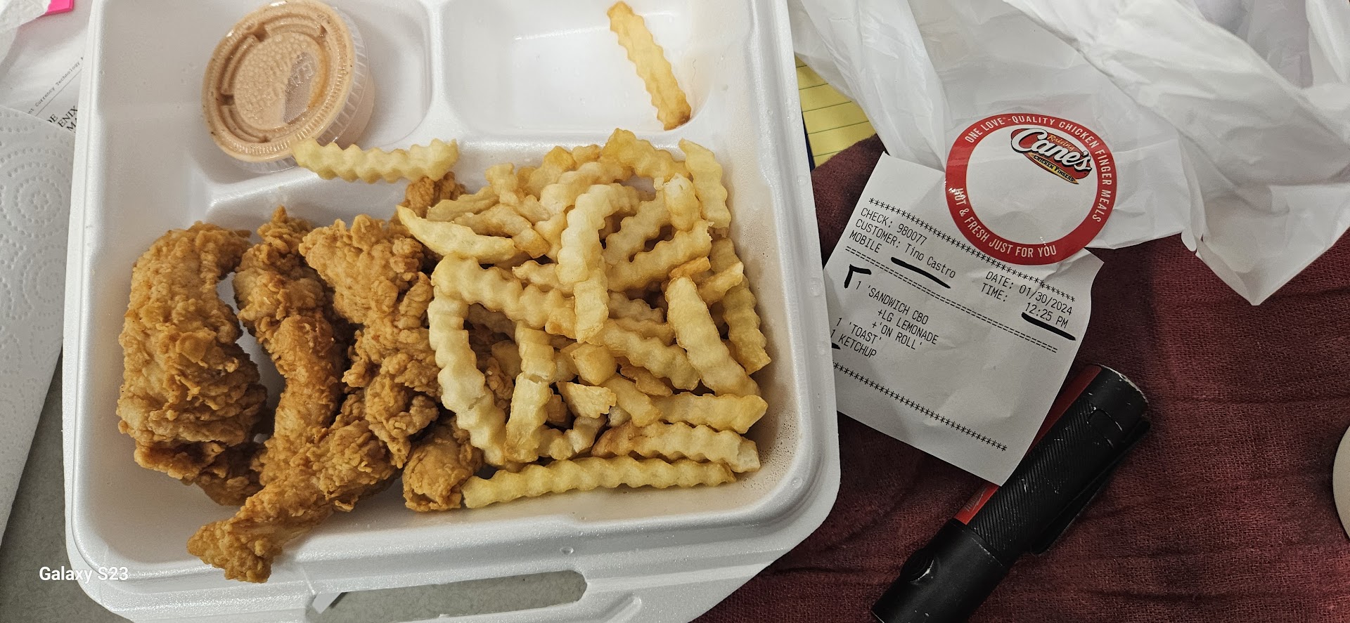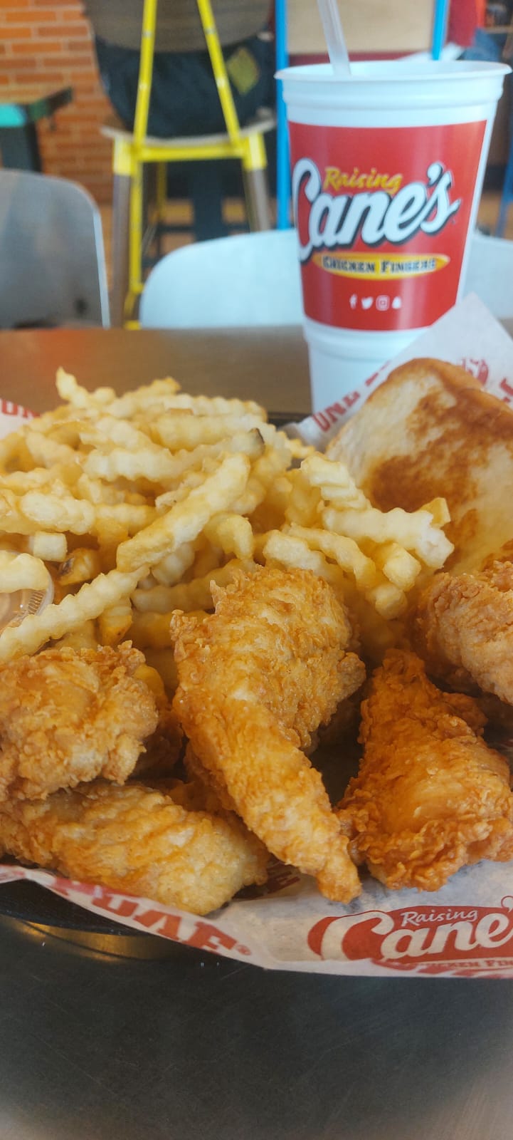 I placed mobile pickup order. Upon arrival, I made my way inside where I was pleasantly greeted. (1st time customer at Raising Cane's.). I informed the gentleman who waited on me of mobile order and he graciously directed me to my meal on the pick-up shelf. (App still said food was being prepared. Is this a web issue or in-house?). Once I got home, I opened my meal (Caniac) w/half sweet tea & lemonade.