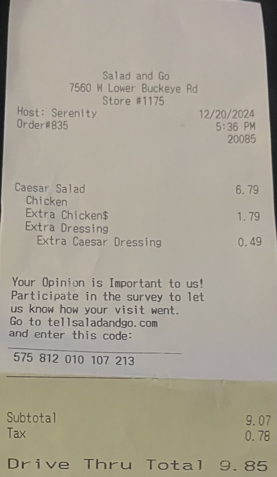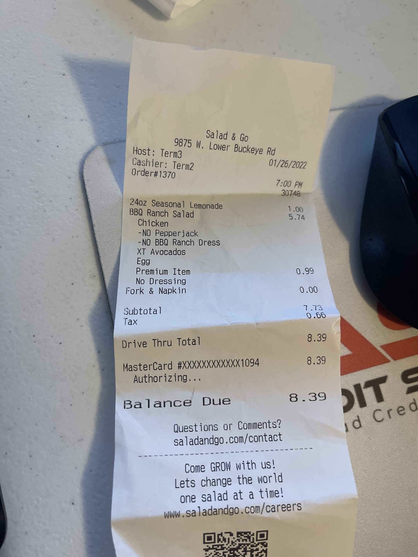 Read moreA week ago I bought a salad to take to work for lunch, while eating it I found the tomatoes rotten and tasted so bad it ruined the salad! I tried to call them to let them know, but no Phone number is listed, so I tried the web site, found the contact us and explained the issue, they asked for pictures of the receipt and a picture of the issue with the product, which I provided. got a confirmation email and so far I have not heard from them in regards to that one. today I decided to get another salad for work, ordered my usual that is saved in my app... this time they forgot the dressing, so here I am at work.. eating a plain salad like a rabbit because they forgot it. I work long hours at a hospital, surrounded by covid+ patients and the only joy I get is my lunch... today marks the 2nd time salad and go has let me down. perhaps the hype is over and now their salad components are low grade and not worth the $7+ I spend on them. will update this review if they contact me, in the mean time no more food from them and will let my friends and family know my experiences.