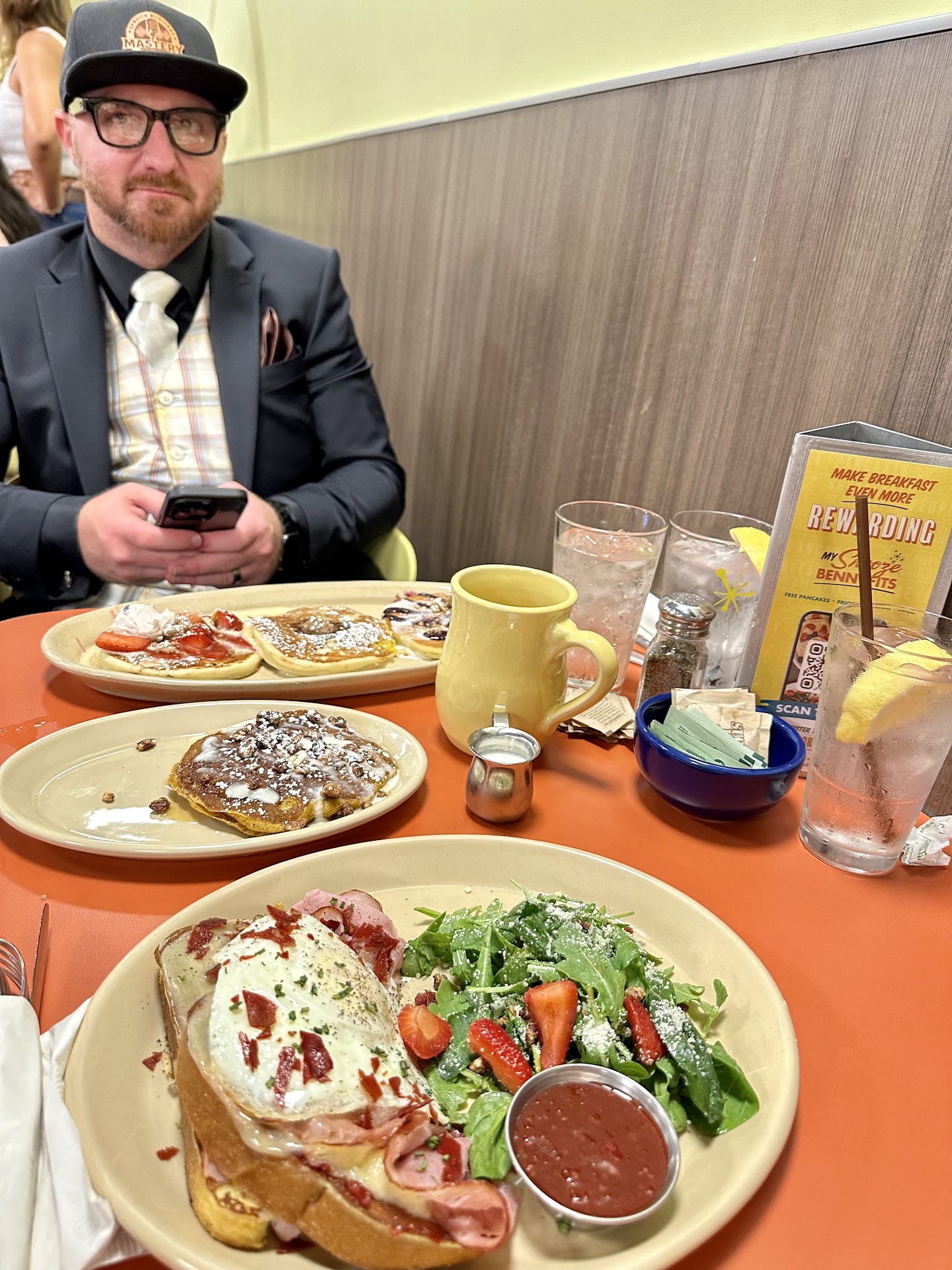 The first server surprisingly gifted our table a free Cinnamon Bun Pancake that was seriously ridiculous in how good it was. The dish is very sweet but I am often a fan of sweet foods. When the meal was over he also provided the table with a couple of complimentary pancake cards for my next visit. So unexpected and not necessary given he had already provided the table with the free pancake. Another sign of true quality and of someone who cares about providing quality service to others. Something I wasn't certain existed to this level in Phoenix, but these people but a bright light to my day and gave me assurance that quality does exist here. Kudos to them for that and I will always be a supporter of them.