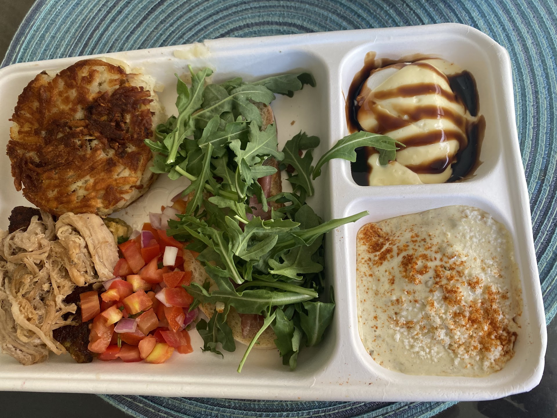 The main dish I chose was a Spanish take on eggs Benedict with a Chilaquiles component. I am not a fan of poached eggs. They were very happy to make a substitution. The dish had a bottom layer of crispy corn chips layered with shredded pork, green chili sauce and another tortilla chip. On top they put scrambled eggs as requested. The bearnaise sauce was made with green chili and served on the side. They gave a nice serving of pico and a round of beautifully cooked hashbrowns. The dish has shredded cheese and cojito cheese. I asked to not include cheese.