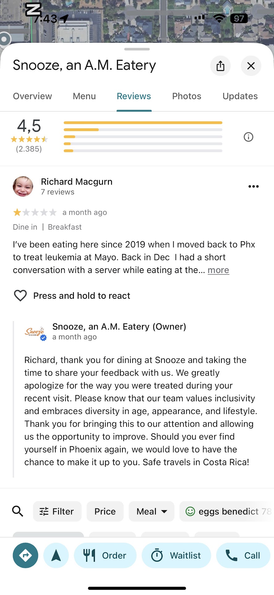 I’ve been eating here since 2019 when I moved back to Phx to treat leukemia at Mayo. Back in Dec I had a short conversation with a server while eating at the counter. He was chatting with a few others at the counter and I noticed he looked very fit. We discussed that he went to the gym 3x a week and he told me he was 22. As a 71 yo man I told him to add aerobics or running as he had a beer belly, we called it in my day. I said take it from someone older than your grandfather as good advice for a long and healthy life. When I finished and left a young lady followed me out to discuss an interaction I had with one of her staff. Once we established she was talking about a conversation I recounted what I said and what my point was. She said she was going to ask me to not return to her restaurant any more. But after we talked she said it was ok. Yesterday I was just finished ordering my breakfast at the bar and went to the bathroom. When I returned a large mid 30’s guy with both arms full sleeve tattoos came and asked me to leave. I’m 165 and 6’ now 72. When I realized he wasn’t joking I asked him why what was the issue. He told me I knew and not to come back. I noticed both the young man and the lady from before were working as I left. This is a perfect example of the woke bs culture that has taken over millennials and gen Z in the U.S. I am glad I returned to my home in Costa Rica today. While I will miss the few girls that work behind the counter I will not miss their childish managers and the young waiter who could only feel hurt when given good advice from an old man. Now at 72 I have a son of 13 who I’ve raised alone in Costa Rica and I will say he, like me, feels sorry for the woke nonsense that has consumed the U.S. I cannot recommend this place to anyone who values truth and honestly over sensitivity and wokeness. Updated today 5/4/25. I found myself in Phx again for a medical visit to Mayo. Stopped in for breakfast and ignoring owners invitation to return Mario Frongillo, his card says the Maverick, try to his name said I could not be served and didn’t cat what the owner said. Interesting where the pays help override the owners instructions. I can’t say I’m surprised as often when it’s about people wanting to win they lose sight of things. Again he refused to explain why telling me he told me part time. I reminded him that he only told me I knew why. And there you have it. Sad but honestly there are many great choices for breakfast and it makes no sense to waste time and money on a place run by nut jobs on...