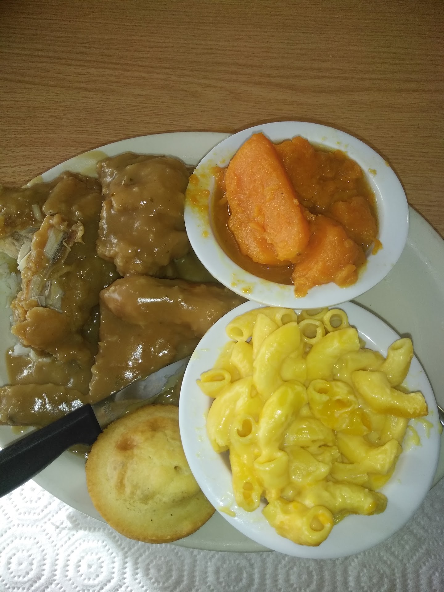 I ordered the smothered chicken which comes with rice, Mac&cheese and some yams. Then some friend chicken to go.