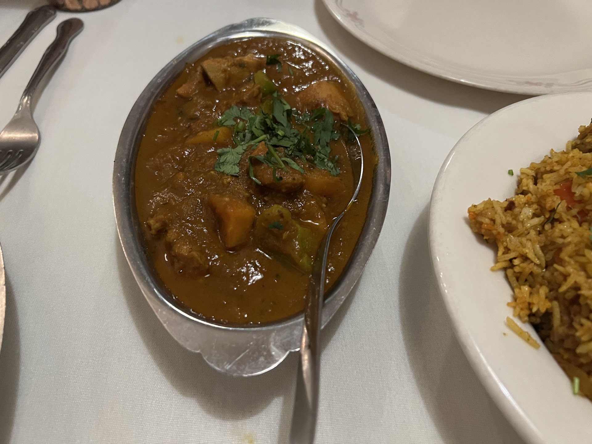 We arrived at 6:45 and we seated momentarily. Fresh white tablecloth, gentle spice aroma but not where you will leave smelling like vindaloo and frying oil. We got an order of samosas which came out relatively quickly, around 7pm but no one ever asked us what we wanted to drink. They did keep the water glasses filled though. At 7:40 we had to ask a server where our mains were. He said they had gotten a little backed up in the kitchen but ours would be out next, about 2-3 more minutes. At 7:50, we asked another server where our food was, at this point I had a headache and was jittery from being hungry - I had worked all day and hadn't had lunch. She also said 2-3 more minutes. 2 tables that had been seated after us had been served, paid, and left after getting both appetizers and mains. Finally a few minutes after 8, we were served.