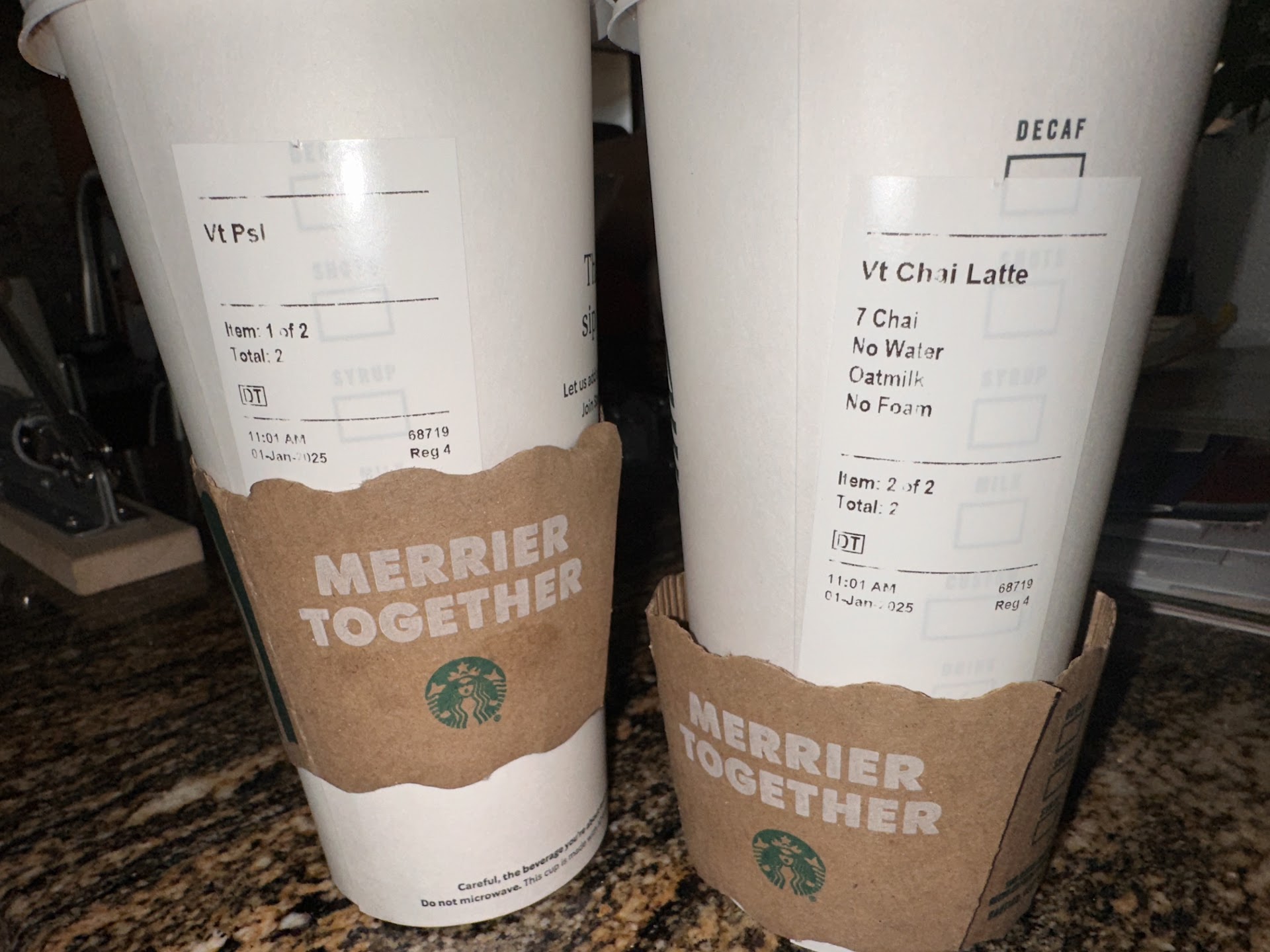 Read more1/1/25 1000am I ordered a traditional pumpkin spice latte Venti Hot and a Venti hot chai latte no foam. This is a third time I go to this location. Every time I ask myself why do I keep coming back because their orders are always incorrect. it appears there’s a quarter of foam left in the cup. I like the fast and friendly service. Staff at the window are courteous and pleasant to speak with. It appears the baristas don’t have proper...