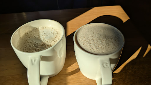 Went there with my wife (her app, I used to have one but I cancelled years ago after too many annoying emails from Starbucks) and ordered one Venti Latte and one Grande Latte in "for here" cups. She got one, dropped it off for me and went to pick up the other. She was engaged in a lengthy conversation with the male barista before joining me with the second cup. She was laughing because the Venti mug (with a big V on the top of the handle) looked about 1" short while the Grande (with a big G on the top of the handle) looked about the right level of fill. They looked about the same volume, but in different size cups. The stupid barista argued that the Grande mug was actually the Venti order and that the shorted Venti mug was actually the Grande and thus short about 1". My wife told him he could top off the Venti and everything would be fine. He said he would have to charge extra for the added amount of coffee. This for a Venti we had already paid for but was 1" short! In his defence I assume he didn't notice the different sized mugs, or the letters identifying them. Maybe he'd never done "for here" mugs before, or maybe he'd never learned to spell. Whatever, he argued while the manager listened. After my wife came back to our table the manager apologized and dropped off a $4 gift card saying that there is no way you can put 20oz of coffee into a 16oz mug. The barista went to their back room. After enjoying our coffees with a laugh we went home. I've never had a Starbucks employee argue with a customer in over 10 yrs of drinking their brew.