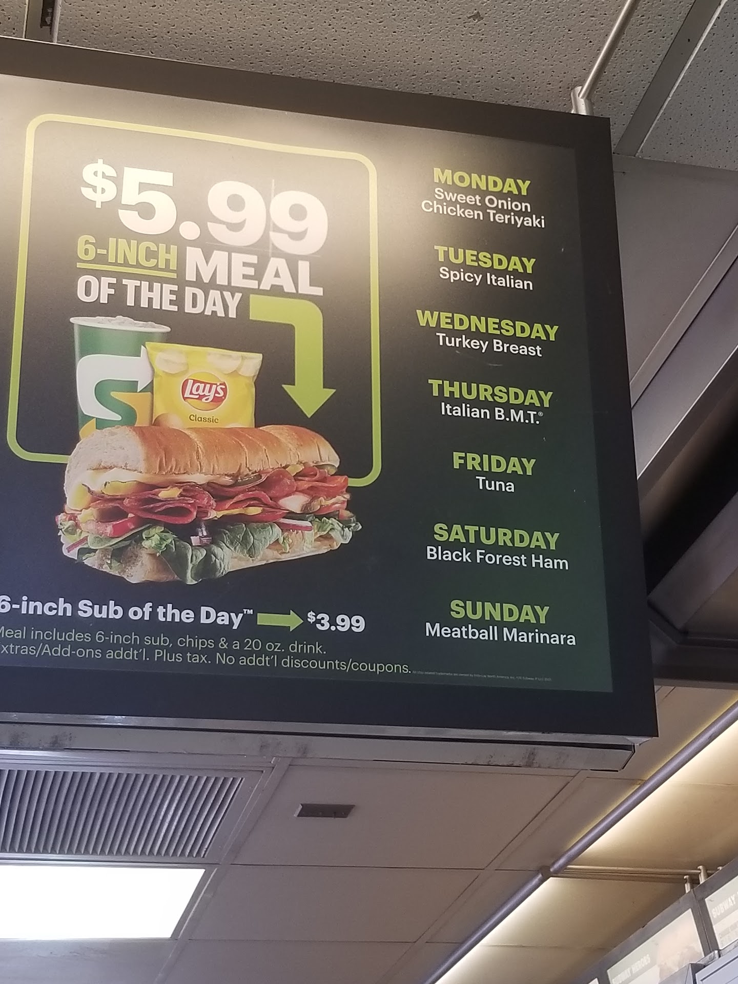 Read moreI am usually happy to go to this particular Subway. But this visit was a bit disappointing this time. I specified my regular whole wheat roll and immediately noticed something different. It was lighter in color. But I passed it off. But when Calvin and I stopped off at a park to eat our wonderful subs, I found out in one bite what was wrong. It was old. The bread had to have been there for a couple of days I believe. It was stiff, dry, crumbly and tasteless. I have never been so unhappy with a Subway sandwich in my entire life. Truthfully, that was a first for me. I have gone to Subways for decades and never even had to worry about crumbly old bread. But I'm willing to overlook this circumstance because of Covid-19. Perhaps someone in charge was sick or caring for someone who was. I'll even go back again. But a couple more times and I will have to figure somebody is just skimping on freshness and hasn't...