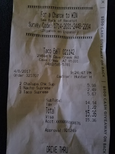 Every experience I've had at this location has been mediocre at best. I just recently moved to Cave Creek and there's only two Taco Bells close enough for me to drive to, this one and the one located in Tramonto Marketplace. I've only used the drive-thru at this location and I have to admit each employee that took my order had the sh*ttiest service and attitudes, not to mention the food was highly unsatisfying. Allow me to briefly go over the few experiences I've had before I made the decision to not go to this location again: Despite the employee punching my order in correctly, what I received wasn't. I didn't check the bag to make sure everything was good before I drove 20 minutes back home, so after I realized he had given me the wrong food I had no intention or motivation to drive 20 minutes back to correct it. That was my first experience at this location. The next couple experiences I had involved one guy messing with his hair continuously while I was waiting and another guy that seemed very out of it and didn't even ask if I wanted any sauce. I know, big whoop right? Yes, I only mention that because the whole experience with him was pretty frustrating and that kind of topped off my opinion that the employees here need to be trained better. Overall opinion: this...