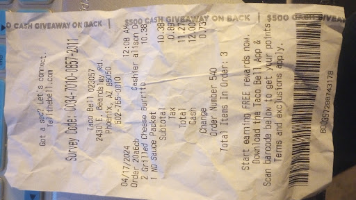 Read moreWent to order in the drive through and the lady ended up charging me for an extra combo meal. And missing part of my order. This is the second time I've gone here and this is the second time they've messed up and forgot things. So what should've been $25 turned into $44. I was wondering why it was so high and I got home and checked the receipt and checked the bag and saw how I was overcharged and the extra combo meal they added, they forgot half the items. And the Baja Blast zero sugar was flat and was as if they ran out the syrup in the machine. Wtf? Normally I use the app to make sure I get what I want without having to hear "is that it?" After every menu item. And this just solidified why I hate ordering at the drive through, because half the stuff isn't put in right. But to have this many problems is a lot. And there's no way to leave a satisfaction survey on their website or app. Otherwise I would've used that instead of Google maps to leave a review. And I freaking love Taco Bell, so I guess I'll have to find a different one that doesn't mess up the only 2 times I've ever been to this location. Hopefully Jacquelyn M (that's the cashier's name on the receipt) doesn't mess up other orders that were in the...
