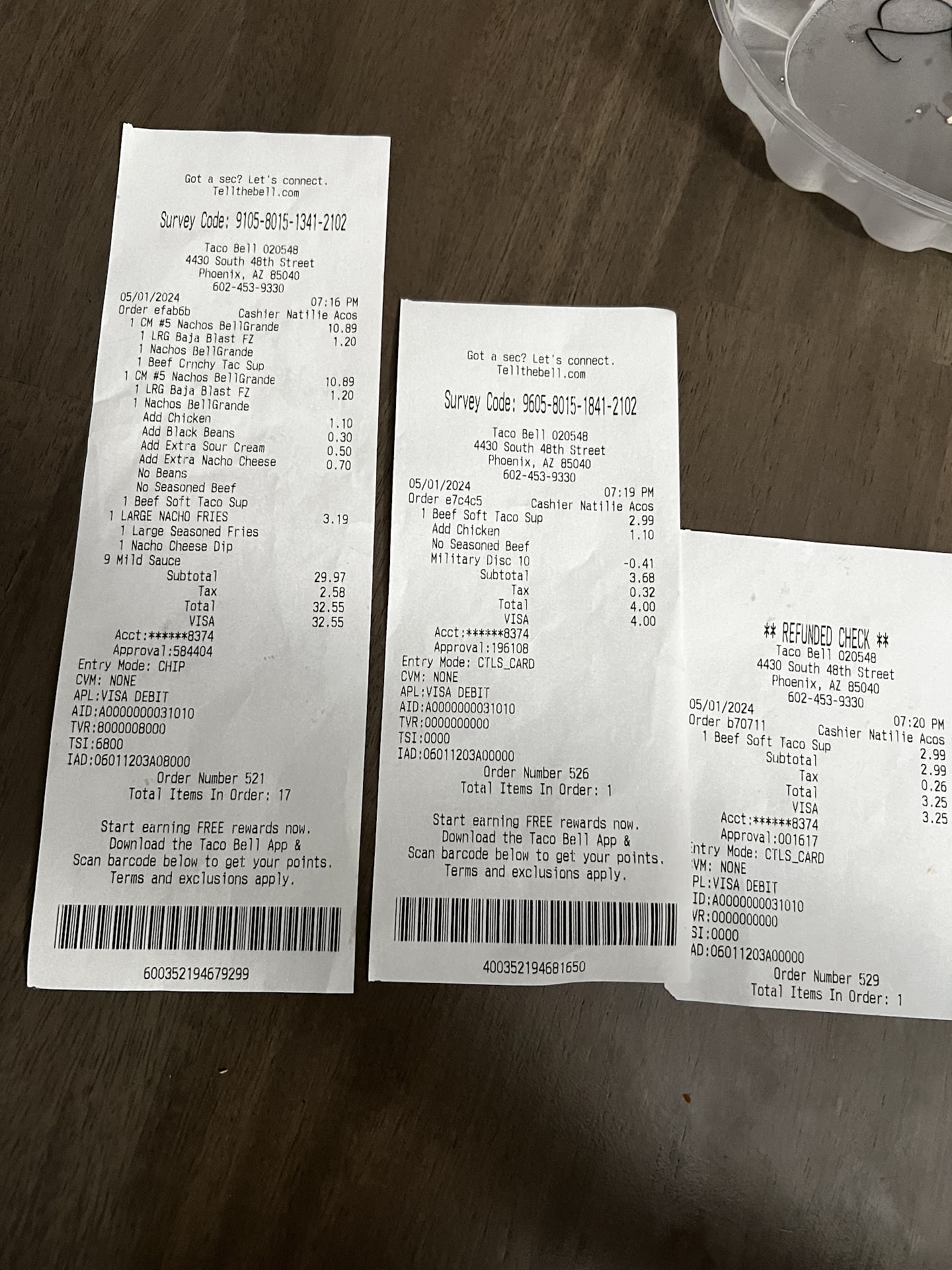 Read moreOn 5/1/24, I visited Taco Bell after a long workday, choosing this location for its proximity to my workplace and usually great service. Despite clearly ordering a chicken taco due to dietary restrictions, my receipt showed a beef taco. When I politely informed the cashier and the apparent manager/lead, they insisted on charging me for an additional taco, claiming the order was correct on their screen. I explained that I don’t eat beef and she became upset that I wouldn’t accept the scam to pay for an additional taco without a refund of the incorrect one. After some back and forth, they finally agreed to refund me for the beef taco, but the manager/lead displayed unprofessional behavior throughout the interaction, with a rude attitude and dismissive demeanor. The cashier, however, remained apologetic and professional. This behavior, especially from someone in a customer-facing role, is unacceptable and should be addressed. The name on my receipt is Natalie Acos, I am unsure if this is the rude worker or the nice cashier. I hope this feedback reaches the appropriate channels for improvement. Happy to provide additional feedback if needed. My receipts from the order...