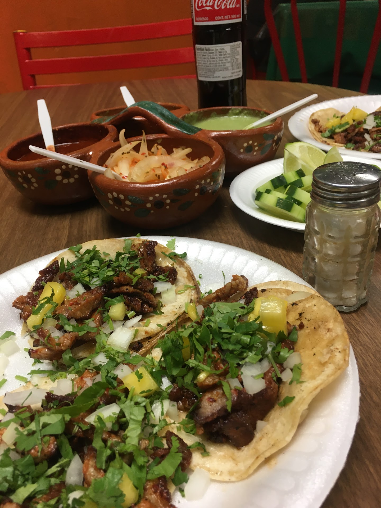 We've been here before and we liked it. Today was another story. My wife ordered tacos de papa and we all placed our orders as well. We sat down and waited for over 20 minutes and the waiter (I think she is the owner) came to the table and said that they were out of tacos de papa why couldn't they say something when I placed the order In the begining. It took at least another 15-20 minutes more to get our food maybe more. This place was not busy it all. My son ordered a quesabirria taco and on the menu it clearly says that you get a cup of consome when you order just one taco. My son got his taco and no consome, we went to ask the waiter (owner) and she said you have to buy 2 quesabirria tacos and got an attitude. The menu clearly states otherwise. The cucumbers were nasty my son and I ate them and we spit them out because they were spoiled and the cabbage was really yellow looking. We told the waiter (owner) and she took the cabbage. we wanted some cabbage and she said she had some but it wasn't cut up. Will not be going back to this place anymore and does not recommend this place at all.