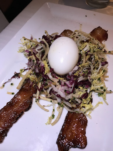 Warm "Bacon Candy" with Frisée, Radicchio, Soft Poached Egg I’m not really sure why you need to sous vide an egg... the dish didn’t make much sense to me because you have a lot of salad and just one eggs... it should have been a smaller portion salad, the bacon should have been chopped up and mixed with the salad. Instead you get one bite of egg, spending 5 minutes trying to grapple with cutting the bacon. The flavors make sense just not the final dish! Least there was an attempt here sort of...