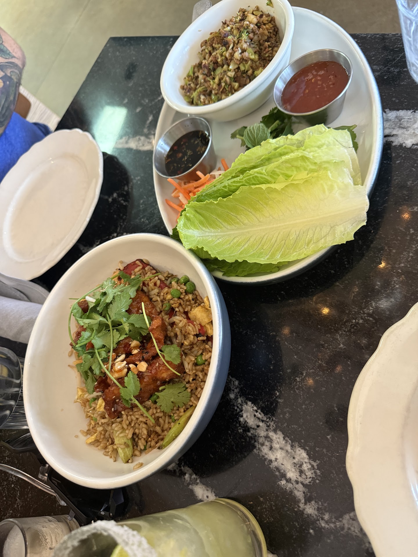 Always looking to discover a new gem. Found out Southern Rail closed permanently and replaced by Tesota. We rallied up on Saturday night for dinner. Missed Happy Hour by 15 min (definitely stopping by another night to try the charcuterie board and wings as both are featured on the HH menu. 2-6:05pm). We ordered the rice paper spring rolls to share. It was more gimmicky than expected. The rice paper wrapping definitely gave it a unique, crispy yet chewy texture. However, the filling had a very bland taste, lacking in flavor (keep in mind, this will continue to be a trend as the review continues). It relied too heavily on the seaweed inside and the overly pungent ponzu sauce that accompanied it. The sauce had 1 dimension, and that was just tart. It lacked a sweetness to it. Ponzu should be tart yet sweet. The sauce hits you really hard and suddenly, not in a pleasant way. The fish katsu sandwich was cooked to perfection. Ingredients were fresh, the bread was soft and cloud-like, fish fried up masterfully, and whatever mayo or dressings added was yum yum! But, like the rice paper rolls, it lacked flavoring or seasoning overall. I'd rank this fish sandwich in my top 10 of PHX if it just satisfied the taste buds a bit more. I'd also recommend opting for the side salad instead of the fries. They serve a waffle fry that is way too thin. Waffle fries should be thicker so that one can taste and notice the potato more, ya know, the "waffle" aspect. Theirs are too thin and therefore, too crispy. I do not even remember there ever was time I thought fries were "too" crispy. Well, never say "never." My sister tried their Summer White pizza. Which I tried a slice and can only describe it as someone went into their home garden and picked out whatever veggies are fresh at the moment, slapped it on a pizza, and added cheese. Fresh, well baked, nice dough texture, but again, no real flavor or taste, just a tad bit bland. 2/3 of had a hard time picking up any of the truffle. Overall, the 3 of us did all quite enjoy their featured pork special though. Pork was cooked perfectly, juicy as could be. The jam they added on top made the dish unique and memorable. And the risotto, wow, the real star. Lots of places screw up risotto by over cooking it. Not Tesota, it was fantastic! Shame it's not a regular menu item. I don't think risotto itself is even featured anywhere else on their menu. This place is new and I hope they will find ways to improve and enhance their menu. I'll give it a minute and come back to try their wings and other menu items that piqued my interest. Tons of outdoor patio seating so will likely be an awesome place to hang out once weather is friendlier. Their inside bar seating...