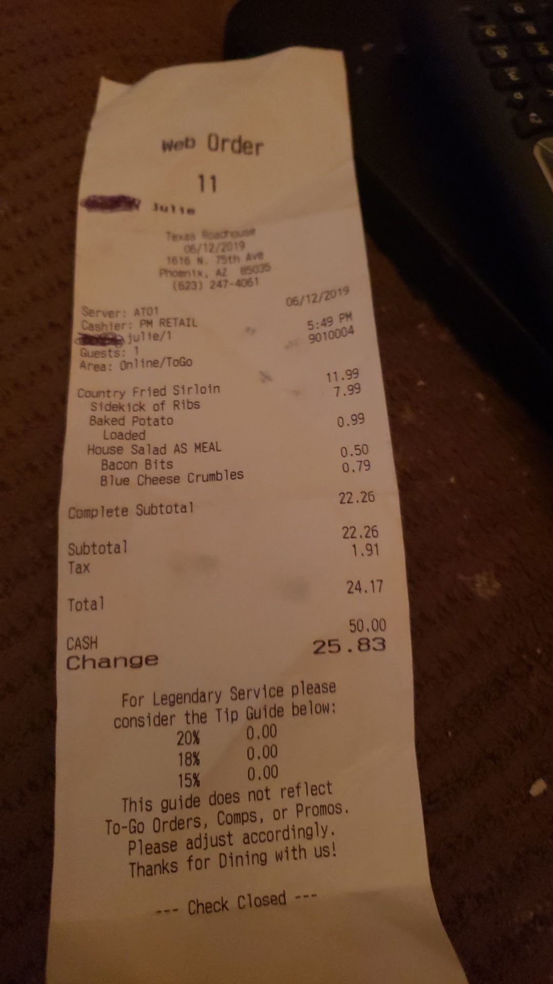Read moreI haven't been here in a while, but I loved the food, so I decided to get take out, I ordered online a few min after 5pm and it was back to regular price, no big deal, i got there, it was not busy. The girl at take out and her buddy manager?, Were a bit attitudish... she read order off receipt and I thought I had a onion blossom free with my online order. she was quick to call her manager and he was quick to tell me no, and they both went on about you don't get a free appetizer, (it is advertised on web menu) she said my food was done.. Ok...I was kind of surprised it was ready, I've had to wait long times for take out but It was wirth it. she put I't on the counter and wen't through it fast. I ask about a few things, the free appetizer, that they said I didn't get, and she said if I ordered it now, it would take 20 min befor I't was ready, and my other food was done. she insinuated I made it up.. or I didn't order it. Now, I'm irritated, I'f I'm going to spend $30. On an early take outmeal for 1 person, please make sure it's fresh..I got home, took food out, each of the 4 containers...I had chicken fried steak, that had to of been made 3-4 hours prior, crust was grease soaked and meat was hard and dried out, what little meat was in there. There was no seasoning, no taste. The baked potatoe, was with it and must of been from night before, salt crust was half on,in chunks and broken off in dry gluteny potatoe. Ribs were good, compared to rest of the food. house salad, had minimal toppings, no croutons, and I had to ask 3 times till I got extra dressing, she told me, you didn't order it online... but, I'm asking for it. Why would you argue about that? then the dressing tasted like the diet/ fat free kind , did they change the brand of ranch? usually the food was really good, did they change management? I'm so disappointed , wasted hard earned money to have nice dinner, I paid cash ans she seemed irritated she wan't getting tipped, I still tipped her, I cook well, and that was not ok. Really disappointed....