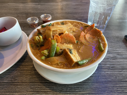 The food was delicious, but an incident that occurred will not have us returning here again. We ordered wings and neglected to ask for the sauce on the side. When we asked the waiter to redo it, he told us it wasn't possible. When speaking to a manager, we were told that we would have to order and pay for a second order of wings. Mind you, our overall order was not a small one. I told the manager that I disagreed with his inflexible policy, and having worked in the restaurant industry know that extending such a courtesy was pretty standard. He refused, and we declined ordering a second plate of wings. The waiter eventually came back and told us he was taking the wings off the bill. Because the wings were such a hassle, we didn't even bother addressing the fact that they screwed up our fried rice order and forgot to bring a drink we had ordered. Just prior to delivering me my curry dish, my wife apparently saw the manager snickering while looking our way. I found my curry dish's heat extending beyond the level that I specified (level 4, which is normal Thai hot). It was waaaaay spicier than my wife's dish which was level 5 (extra Thai hot). The joke was on them, as I enjoy spicy dishes. However, it was obvious that my meal had been tampered with by a vindictive, immature manager who was unhappy he had to accommodate the customer. This establishment should consider itself lucky that I don't have a medical condition, or I would likely have a nice settlement on my hands. The food was otherwise delicious and the extra heat didn't hurt me any, but my fellow consumers should consider yourselves warned as to the mentality of the immature idiot...