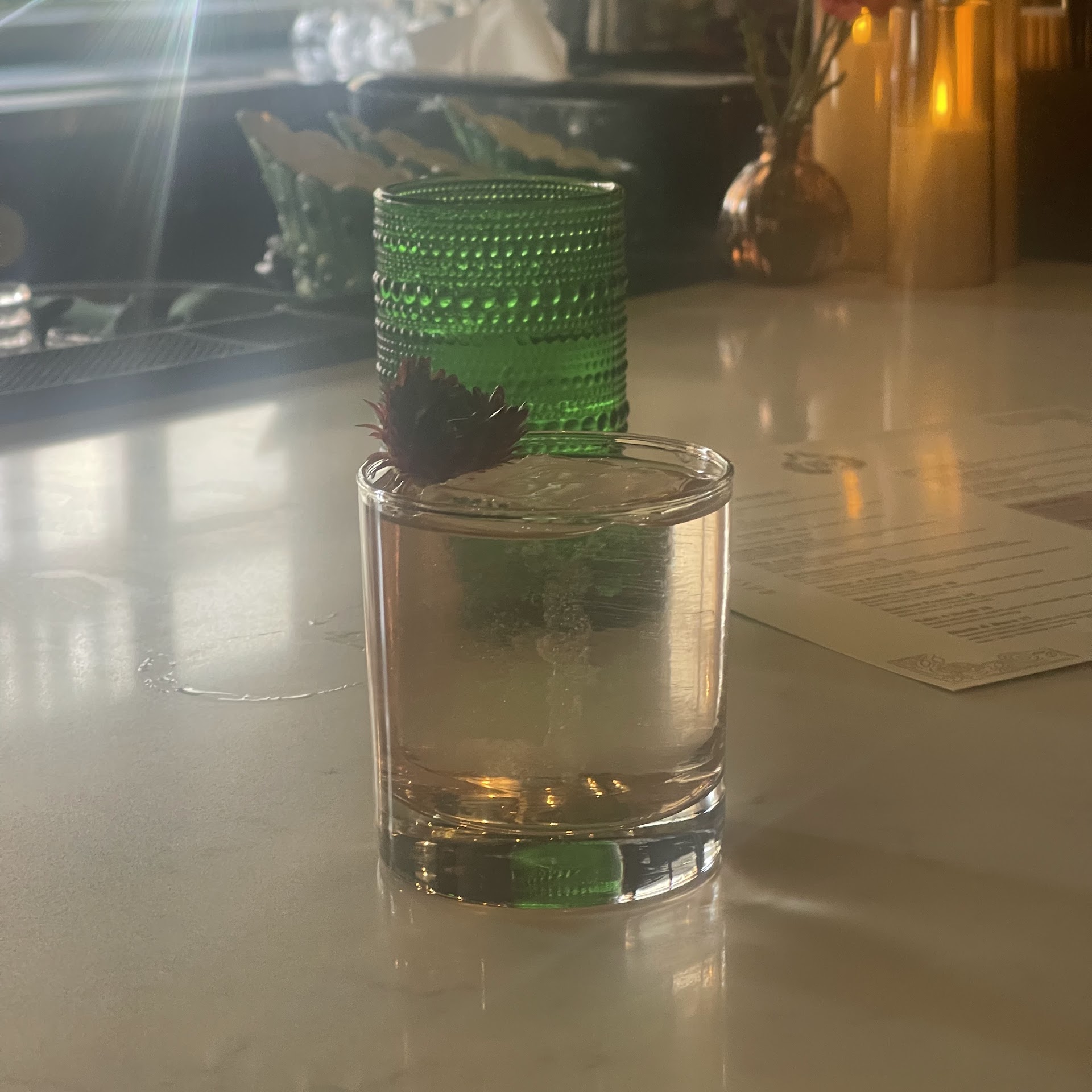 Read moreWe went here for appetizers and cocktails before attending a concert at the Orpheum Theatre. We had missed celebrating our anniversary a month before and this was our make-up date. When we were seated we were a little disappointed with the location but the staff was super accommodating and moved us to a cozy and comfortable booth that was perfect. The staff worked together serving patrons in a team format. For the most part, Marissa, was our server and she was very kind and helpful, guiding us from cocktail to cocktail to suit our taste. During our visit there several other staff members (Katie, Shelby, Kat) stopped by to make sure we had everything we needed. Between us, we ordered La Puesta del Sol, Harvest Essence, and Turaco. All were lovely! My husband had the La Puesta del Sol which was a spicy and savory concoction and a great start to the evening. I started with the Turaco, a light strawberry, lemongrass, and ginger vodka drink in a tall wine glass. My husband then, at the suggestion of staff, tried the Harvest Essence. Warmed by mezcal, with the refreshment of grapefruit and lime, and a depth of flavor layered with turmeric and sage, I couldn't stop myself from taking sips of this lovely drink. All were decorated beautifully with fresh herbs and flowers. The appetizers we ordered were the Olive Oil and White Bean Hummus and the Mushroom Balsamic Glaze Tart. The hummus was served with delicious freshly-made and toasted crusty bread. The mushroom tart was a light phyllo-dough base topped with aioli and arugula. Almost at the very end of our time there, Marissa came by with another Harvest Essence and asked if we wanted it on the house; of course, after stealing several sips from my husband's drink we couldn't say no to this generous surprise! The evening was perfect and we will definitely look forward to returning to this little...