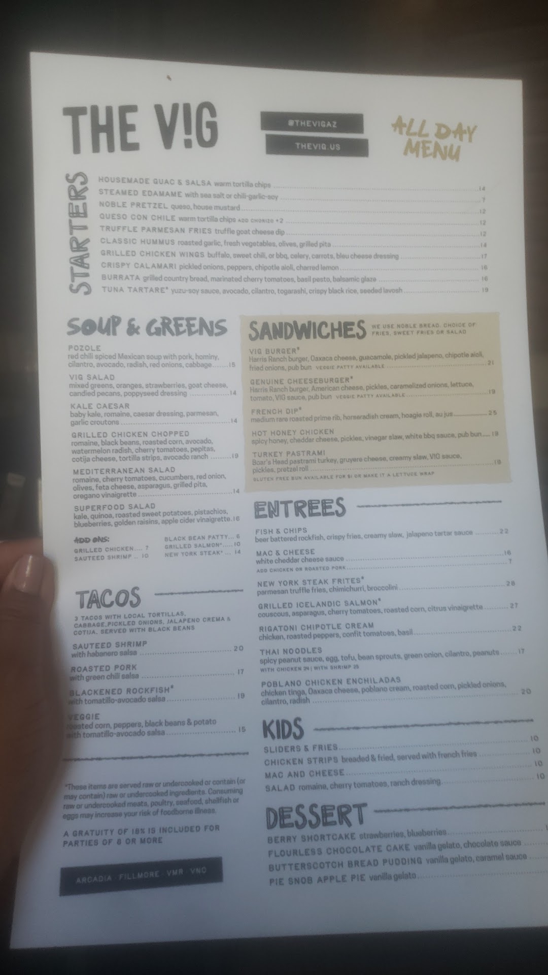 Read moreWITHOUT A DOUBT THE WORST DINING EXPERIENCE I HAVE HAD IN YEARS!!! I took a long time friend out for a birthday dinner. Let me start by saying the only saving grace was the outstanding server Aaron Barnett who was excellent and should find a manager to work under who matches his skill set. We ordered an appetizer and some drinks. We moved on and ordered a brand new item (we were told later) which was the flat iron steak. Both steak dinners including the vegetables were cool and under cooked. We immediately reported the poor meal to the waiter. After about a half hour wait, they brought us two more meals which were also cold and under cooked exactly the same as before. I sent mine back and my friend reported his to the manager -Jasmine as being cold, but he was starving and needed to leave soon and ate a small portion of the meal. Another half hour passed and I received my replacement meal (salmon) and it was hot. After 4 under cooked steak dinners and both he and I eating dinner 1/2 hour apart and almost two hours later the manager Jasmine came to our table to explain they just added the Flat Iron steak to the menu and they are having problems with it and no apology - at all. Soon after our bill arrived. Remember... all 4 steak dinners were under cooked and my friend only took a few bites and gave up. We were charged full price and the bill showed an amount subtracted that should have been for 3 of the 4 bad steak meals. Guess what - the math did not add up and we were charged 4 dollars more than we should have been. The waiter and the manager Jasmine could not figure out how Jasmine did the math. Simply, Aaron came back without an explanation, embarrassed and with the same bill. At this point I gave up and could not wait to get home write this review. I tipped Aaron 20% because he was the only one who knew his job. The manager Jasmine did not care in the least about our experience - side note, as we left Aaron approached us with a couple $1 dollar off drink coupons which I passed on. He also gave us his General Manager’s Card which I considered both responsible and thoughtful. The Vig took what should have been a wonderful birthday dinner and ruined the entire evening. I wish we would have selected a better managed restaurant to...