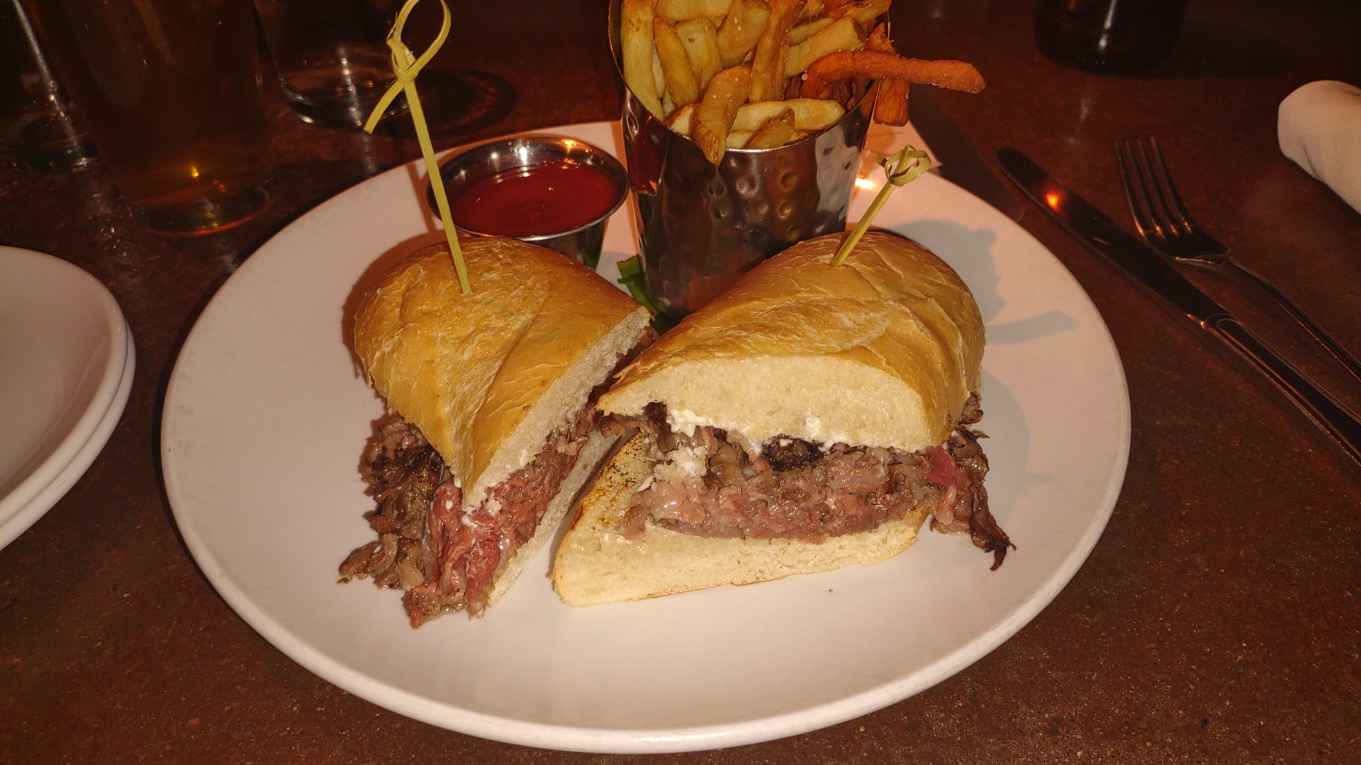(45 minutes in) A few minutes after our dinners arrive and again cannot find our server to request silverware and napkins, in addition to the waters that Sean said were on the way. After waving him down for assistance, he asked how the food was only to realize we haven't eaten yet.
