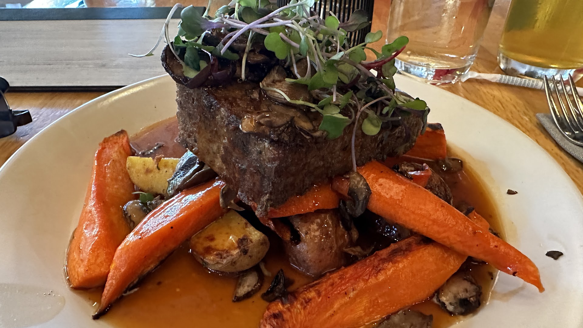 So, we had to pivot. My companion had the ANCIENT GRAINS BOWL (miso sesame glazed sweet potato, charred onion, snap pea, portobello, avocado, organic grains, cilantro & pumpkin seed pesto, hemp seed, turmeric) and I had NOT YOUR MAMAāS MEATLOAF (Verde Farms grass-fed organic beef, herb roasted fingerling potato, honey roasted carrot, mushroom jus, microgreens). I love my mamaās meatloaf and, as advertised, this was not hers. Sorry mom ā this is better. No gross ketchup glaze ā they made an absolutely delicious mushroom jus. The potatoes were old tasting (like they were roasted several days ago), but the carrots were well cooked and delicious. My companion was equally pleased with her meal.