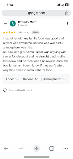 What shocked us even more was what happened after we left. A review appeared online, written under the name of one of our friends, falsely accusing us of arguing for discounts and blackmailing. There were no other customers in the store when the discussion was happening with the server and the reviewer mentioned that he us arguing. We strongly believe that one of the restaurant staff posted that review, mentioning our name. It was deeply upsetting and incredibly disrespectful. This wasn’t just poor service—it was a cheap and unprofessional attempt to shift blame and tarnish someone’s name.