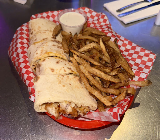 Our experience REALLY went wrong with our food. It took a solid 30 minutes to get a burger and a buffalo chicken sandwich, and when the sandwich came, it was cold and it was wrong. The fries and onion rings were ice cold and my burger was absolutely NOT half a pound of beef. My wife had asked our server if the sandwich came with cheese or lettuce or mayo like the burgers, and he wasn't sure, so she asked him for everything on the side.