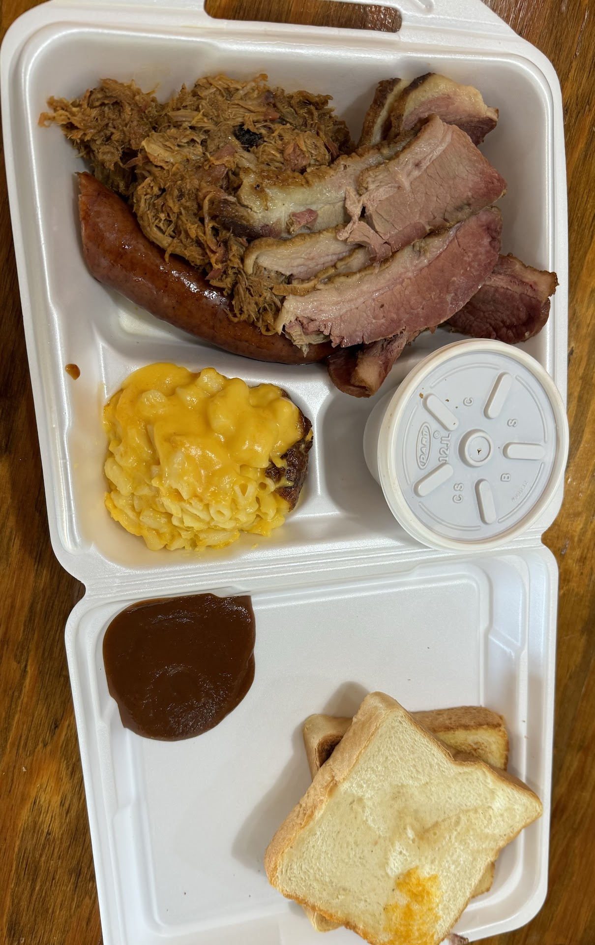 Read moreCame to visit from Hattiesburg and wanted some good BBQ. Google led me here and the reviews were great for the most part and when I drove up there was a line of people waiting to order. The lady that took my order was really nice. I got the 2 meat combo, chicken and brisket. My chicken was moist so that was good. However, no smokey flavor that I could taste and tbh it had a hint of a sweet tea taste to it. The brisket wasn't any better. Hardly any bark and again..no smokey flavor. It reminded me of a baked ham and it was chopped to pieces. I got the Mac n cheese and it tasted really good! It would have been perfect if it were freshly made. Also, if there were more varieties of bbq sauce I may could have saved the meat. Overall, this bbq just...