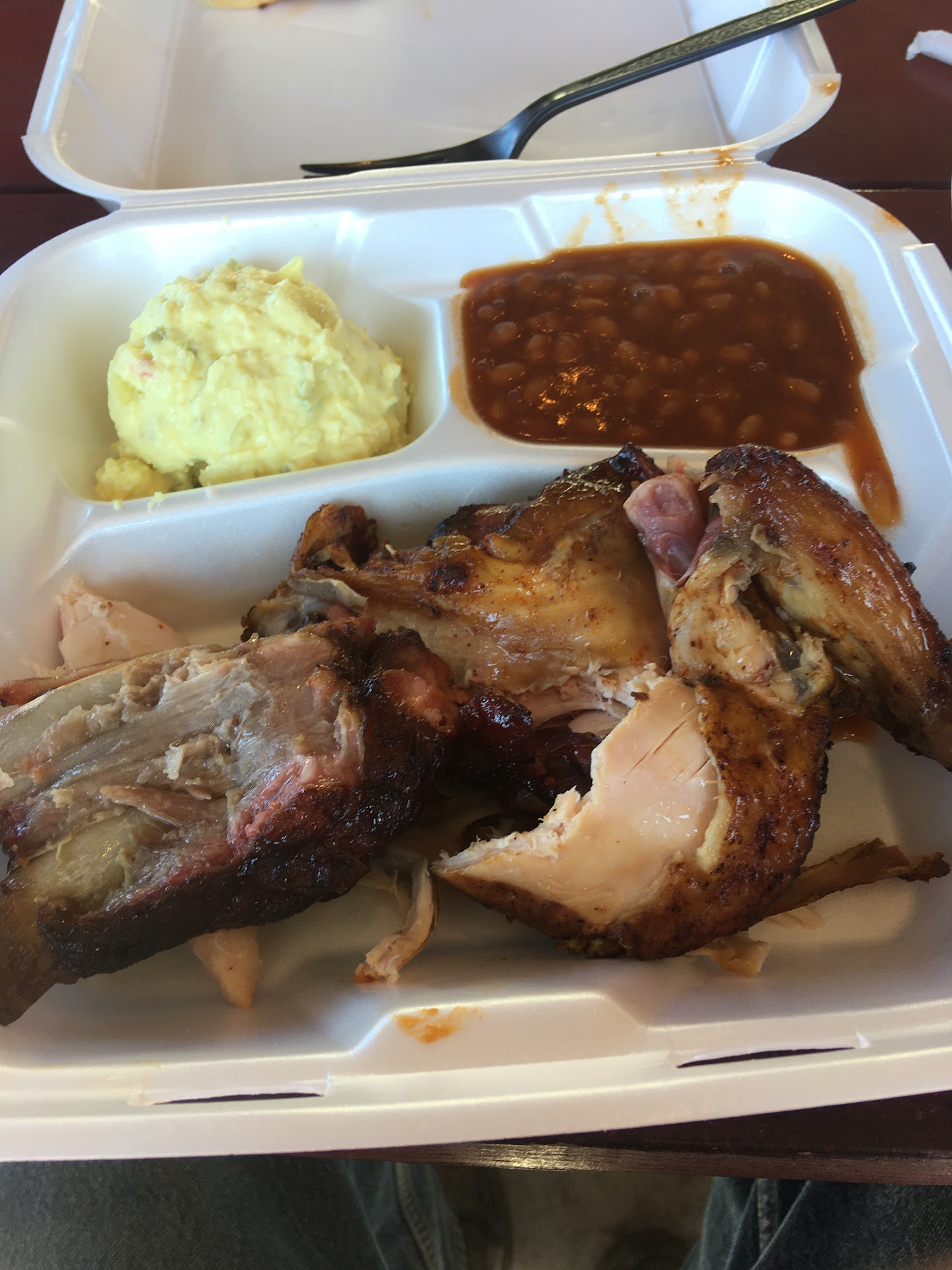 My husband had the 3 meat plate with quarter chicken (dark), ribs, and sausage with cheese potatoes & green beans. His meats were great! Chicken & ribs were tender, fell right off the bone. The sausage, perfect snap! He ate his whole plate!