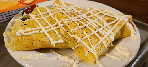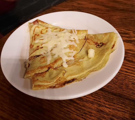 Other items we ordered were the Say Cheese crepe, kinda self explanatory there lol. Monte Cristo crepe, nicely prepared ham, cheese, powdered sugar and something with a bit of heat. That was a good combination. Sawmill crepe, local sausage gravy and I added a poached egg. I'd make that my goto plate! Although with so many interesting items, I'd have to try them first! Next was dessert, the Suzette. Yum! Crepe with orange liquor and vanilla ice cream! It definitely has Creamsicle vibes.