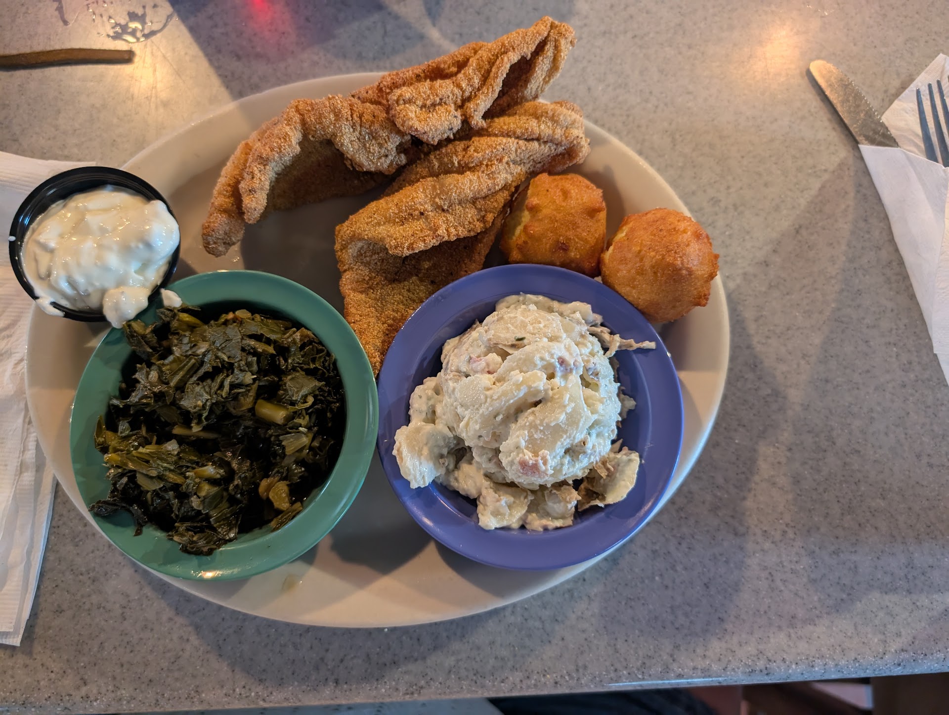 I heard really good things about this place and decided to give it a try. I ordered the pork platter with double onion rings. My pork was nothing but fat, the one bite of meat I did get was soggy and flavorless, maybe a little under cooked. My onion rings were burnt on the outside and hard uncooked on the inside. The Texas toast was the only thing I did eat. My daughter ordered the catfish plater with fries and hush puppies, she doesn't eat hush puppies so she gave them to me, also burnt on the outside and raw uncooked on the inside. I'm not sure they were even safe to eat, ( not just doughy but like box sweet breed mixed straight of bowl raw on the inside) Also didn't eat those. My son ordered a burger and fries, his only complaint was the burger had absolutely no seasoning and was the size of a half dollar and his bun was rock hard. I never do reviews especially bad ones, usually I just eat and never return even if I don't particularly like the food it's usually still eatable. but a $60 tab for us to leave and go eat somewhere else is a bit much. This food wasn't even eatable. I gave one star because the server was nice and concerned why our plates were full after "eating" she asked how the food was and I was honest, she did offer to make us something else but after the first experience it was a waste of her...