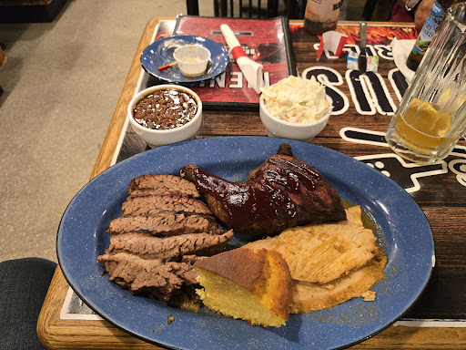 It has often been said that Pierre needs a good BBQ restaurant. Unfortunately, after dining here tonight, it appears that it still does. While the servers were very nice, and the service overall was fairly good, the food wasn't. The Richie's Triple Platter comes with 3 meat choices, 2 sides and cornbread. My girlfriend had the 1 pound Honey BBQ wings. My platter had the pulled pork, 1/4 chicken and Texas Brisket, fries and Onion Rings and we ordered another side of cornbread. First off, the side of cornbread was 4.95. For one slice. The cornbread tasted like yellow cake mix with cornmeal added. It was NOT in any way cornbread. It was also served with margarine and not butter. Southern cooks would be ashamed to serve cornbread without real butter. The 1/4 bbq chicken was dry, bland and clearly overcooked. The sauce added little flavor, and even adding more sauce at the table didn't seem to help. The pulled pork was also very bland. Pulled pork is typically a vinegar based sauce, and tends to be spicy, sweet, or sometimes savory, and should be able to stand without any other sauce added. This version of pulled pork needed sauce to have any flavor at all. It was a fair portion, the largest of the 3 meats. The brisket wasn't brisket, and Texas should sue for allowing their state name to be added to whatever meat this was. While it was tender, it too was very bland, and my girlfriend said it looked more like corned beef than brisket. It came without any sauce, and tasted overcooked. Fries and onion rings were as expected, nothing special and certainly standard fare. The fries were lukewarm, and the onion rings were cold. The platter overall wasn't worth 19.95, and was listed on the menu as 17.95. The wings were tough, bland, and heavily sauced. Almost oversauced to disguise the fact that they were so tough, she couldn't pull the meat off the bone without using her knife. She has been mildly sick since we got home from eating there, so think twice about ordering the wings. If anything, this town needs restaurant owners that know good tasting food. Start there. Brine your meats and smoke them so they are moist and tender and not overcooked. Create sauces that compliment your meats, not disguise the mistakes made in cooking them. While the people in this area are so used to bland, almost inedible food, having a place where great BBQ is served might so shock the tastebuds in Pierre, that you'd see a food revival that would close down all these bland, bad food places. This is not a BBQ restaurant, but a place that has poorly cooked meat...