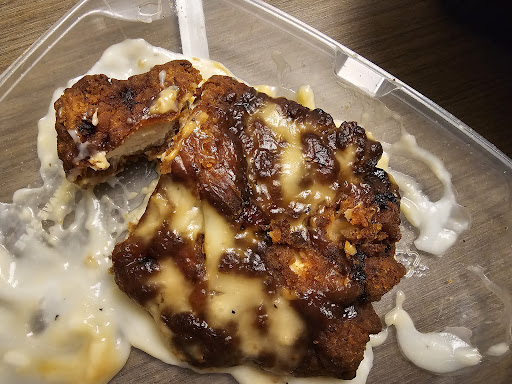 Then she said the GM would call me when they got there. Yeah...after the absolutely disgusting food I was given, the rude and inept customer service, and the dangerous allergen in my food that wasn't meant to be on this to begin with (really, BBQ under my gravy I have a photo of and you tell me you don't do that?) I highly doubt I'll actually recieve a call. But I need a full refund. And not just for the missing sauces which was the only item I was allowed to select in the app. This is just insane. Y'all have to do better. Cause this? This was NOT okay. Not at all. I'll be filing a charge back. And I'll update IF the GM calls me in the morning. But I'm not holding my breath. I mean I am, but because it smells terrible in here. Kinda like a cheap burnt chicken patty with BBQ on it...weird. 😐 SMH...Thanks for nothing...but a stab with my epi-pen.