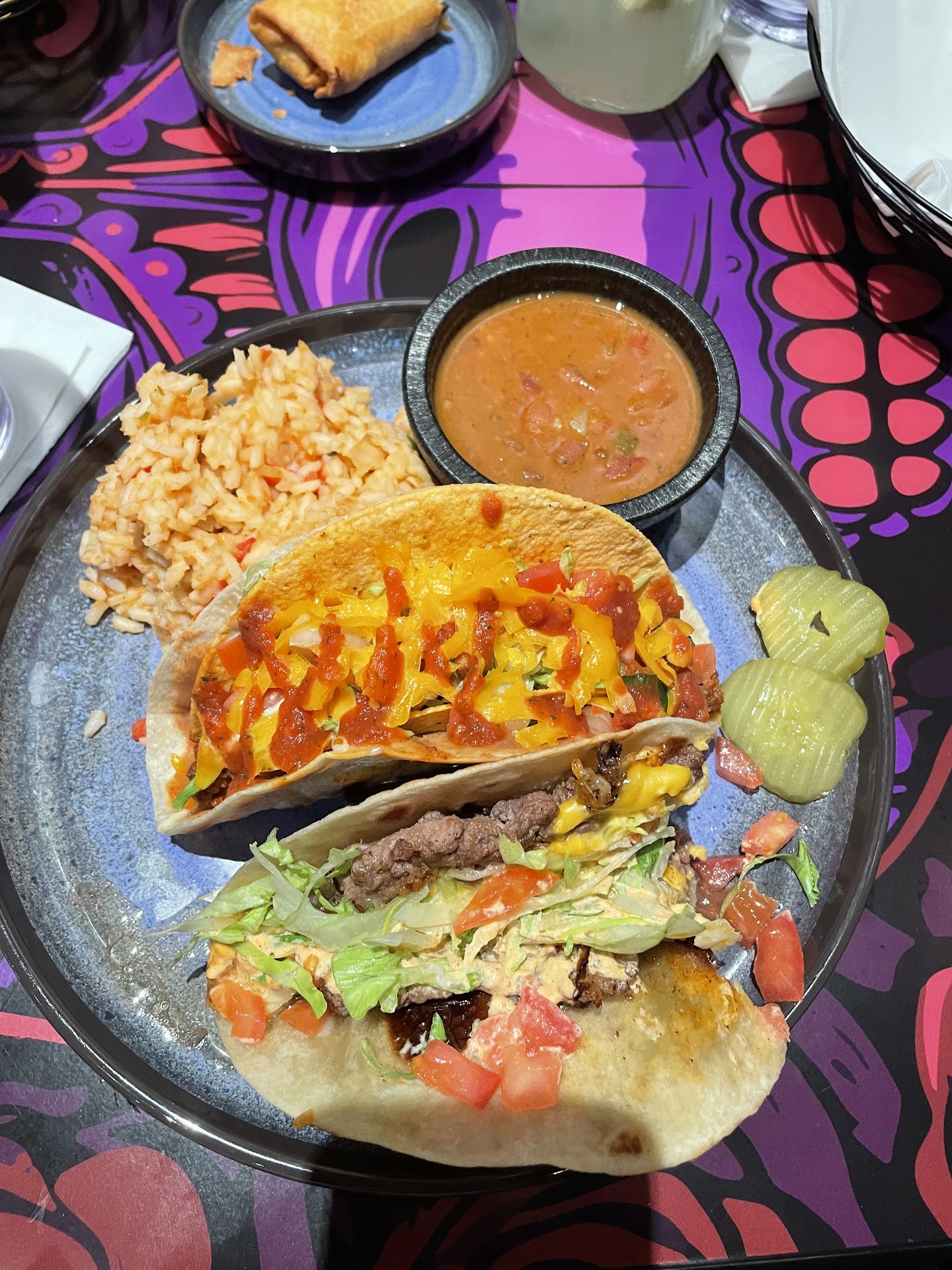 Food 5 Stars: A great atmosphere is a diamond a dozen in pigeon Forge but when it is married with outstanding food, it becomes something truly unique. The menu is diverse, and the food extremely fresh. Whether you order tacos, burritos, or any other item on the menu, you will not be disappointed. I had the Americano taco and the cheeseburger taco both of which I would highly recommend. I am not a drinker, but they had a vast array of margaritas and a full bar, including many different Mexican beers. This is not an ordinary, Mexican restaurant.