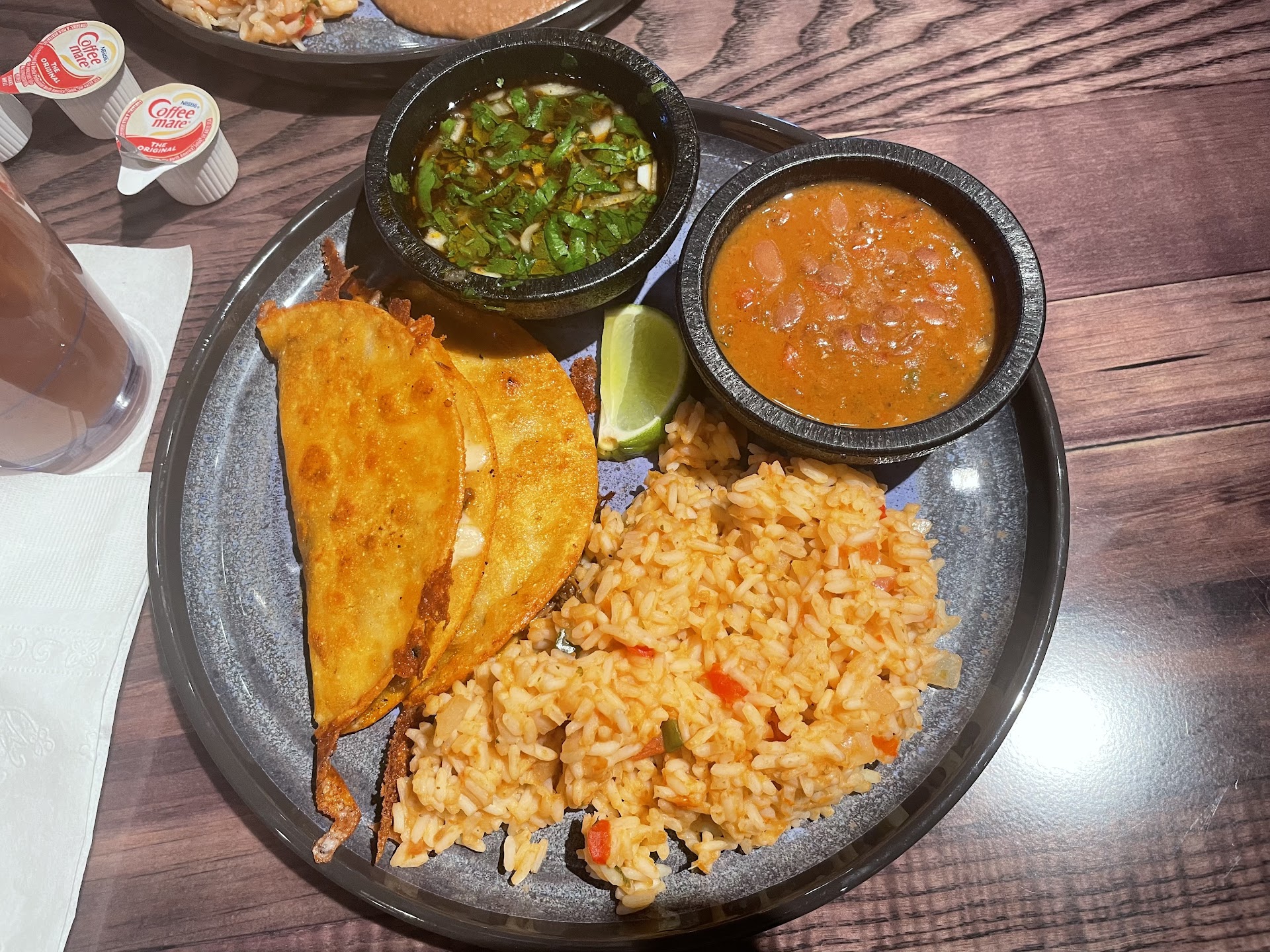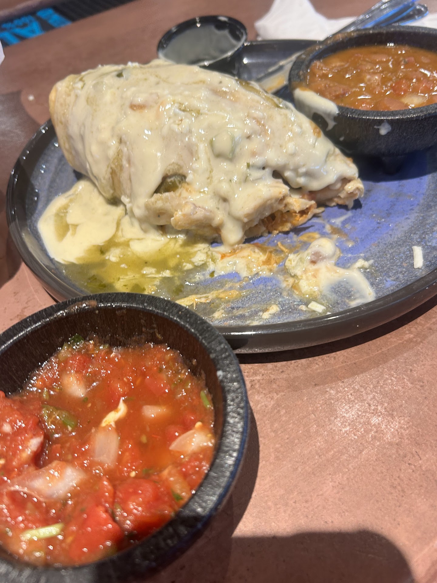 As for the food: I ordered the chicken chimichanga, which came with complimentary chips and salsa. The chips were fresh and the salsa had a chunky, smoky flavor I liked. But unfortunately, the chimichanga itself fell flat. Traditionally, a chimichanga is supposed to be deep-fried to a golden crisp, but this one tasted more like a massive burrito that had been air-fried — lacking the crunch and indulgence I was hoping for. It was topped with a light verde sauce and a sprinkle of Chihuahua cheese, but I expected something richer, like a smothering of queso. The bar did provide a complimentary tiny size side of queso when I mentioned it. The filling was mostly rice, barely any chicken, and what was there lacked flavor. Left half the portion uneaten, no to go box. My taste buds were waiting for something that never showed up. Honestly, it reminded me of something I could’ve gotten at Taco Bell for a third of the price, but with more flavor.