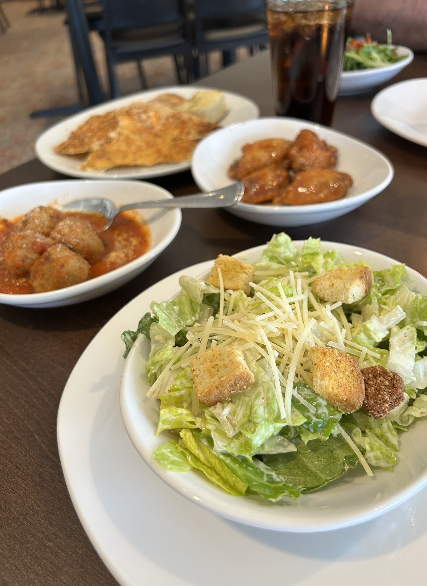 To clarify how this is set up works, first you have to order your appetizers before you get into them serving you pizza. All of the appetizers are included in the price that you pay which include a Caesar salad, vinaigrette, type salad, focaccia, bread, meatballs, and various styles of chicken wings. I would honestly say, the appetizers were probably the biggest pleaser across the board between our group and they gave us options of flavors for the chicken wings, like buffalo, garlic parmesan, lemon pepper, buffalo and teriyaki.
