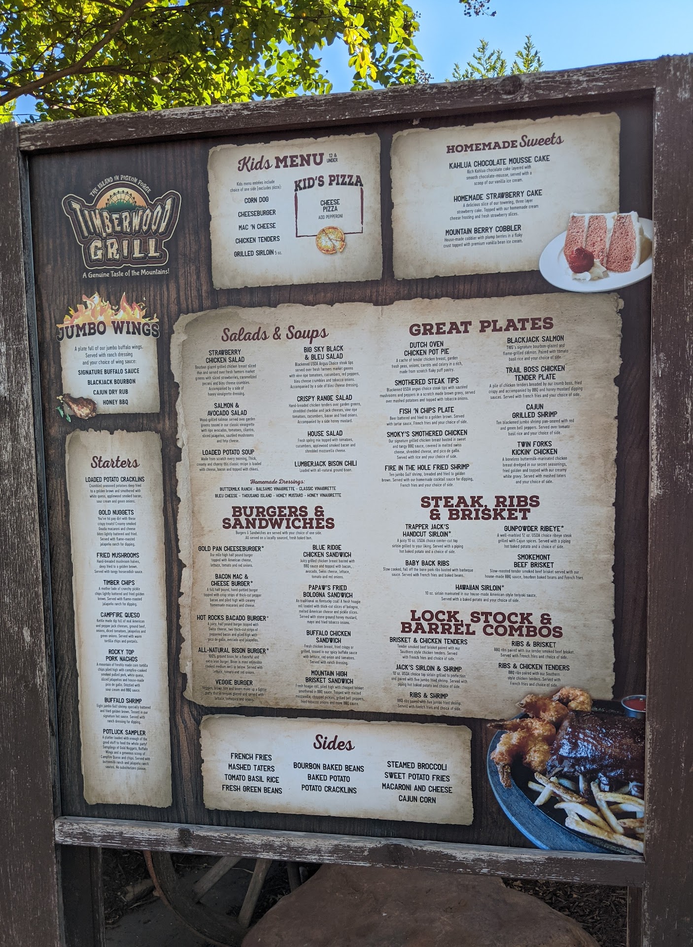 Timberwood grill hum... When you arrive to grill at the island, it looks good. Then menu (no pricing) is outside, the grill has a stone look. When you walk into the grill they have a dark look inside, taxidermy animals everywhere which was nice. We were a party of 7 who arrived around 6pm. We were seated immediately. The server was nice but hardly could understand anything. We all order our drinks (came immediately), we ordered our food. Food didn't take long to come out. Most of us ordered a burger of some sorts. My youngest got the bacon cheeseburger (smoky burger or something like that) it comes with bacon, bbq sauce and cheese and burger). We asked for only cheese and bacon on the burger. Here comes his burger out, everything on it. We told the waiter that's not what was asked for. He takes it back comes immediately back with it. They took the burger scraped off the onions and bbq sauce (as much as they could) put it on a new bun. I told him that was unacceptable. The waiter said that's how they do things. They don't remake something so small. All the burgers were very over cooked, tough and dry to chew, bacon was like rocks on all our burgers. It took some might with your own hands to snap it. We explained to the server that we were unhappy with the food. The brisket sandwich was "pile high brisket" it had 3 slices of brisket. It was disgusting and dried out. We were very unhappy with service. We packed our food up and left. No one really ate, either left it or took it with us to try to doctor it up at the hotel. Then what puts the topping on the cake, we get extra charges to our account. We have contacted the restaurant to see about these charges with the extent of, a manager will call you back. It's day 2 and no response from the manager. The money we spent, food should've been...