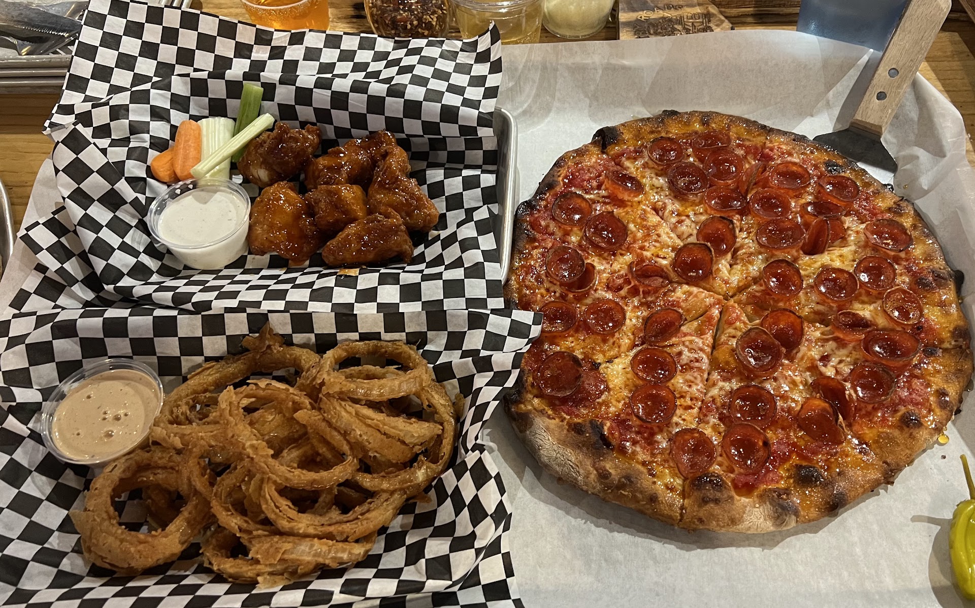 Read moreWe ordered the Big Thrillbilly Trio through a food delivery service. The food delivery service was great but this restaurant not so much. Let me see where to start. My husband paid an extra $2 to have fried pickles included as our third item and we did not even receive them. Then his wings had the wrong sauce. The pizza was cold (which we would have accepted being that it was for delivery and that sometimes happen IF everything on the order had been correct.) But the pizza was soggy. And tough to chew. They also did not give him the blue cheese for his wings. Also, they sent a nasty looking order of onion rings that I would not have even dared let leave my restaurant. Seriously the breading was not even on the onion ring and they were just onions with breading sitting beside them and they were stone cold, greasy, and looked so unappetizing that I chose to skip their pizza as well and eat leftovers from another restaurant that we had in the fridge. Very disappointed to know we spent over $50 (this was just for the food and not the delivery fee) and for $50+ he ate 3 wings with the wrong flavor and without dipping sauce and 2 pieces of reheated pizza. I wasn't going to waste my time with a review and thought I'd just call them and make them aware, but they don't answer the phone any better than they cook apparently. And so I decided to put in a Google review because my husband spent over an hour reading reviews of different pizza places and this one had SO many good reviews I felt like I should at least warn the next guys who go...