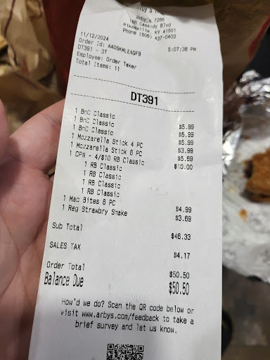 Read moreWe were only here for a few minutes but it was a positive experience. A lot of times when I go through a drive through the staff seemed rushed. I do understand that they are trying to keep the line moving, but sometimes they respond like AI on an assembly line 🤣😂. We rarely eat at Arby’s so we needed the extra time to look over the menu. And on top of that they also have a lot of options when it comes to the sides you can pick with a combo. The young lady at the window was very patient and friendly (even repeating the sides twice for me 😂). So now that I’ve explained why the service was 5 ⭐️ +, I’ll rate the food. We chose a ham and swiss combo with curly fries. The curly fries were slightly over cooked which made them a little hard and crunchy. And even though they were seasoned nicely, you could taste that they were a little burnt. This would have routinely caused me to give the food a lower rating, but the ham and swiss was the star of the show. The portions of ham was fantastic, better than expected. And the ham was juicy and perfectly seasoned. The bun was also soft and very fresh. The ham sandwich gets a 7.5 ⭐️’s out of 5. Bringing the 2.5 curly fries up and making it a 5 star review. With the delicious food and amazing customer service (at least on my visit) I would definitely suggest...