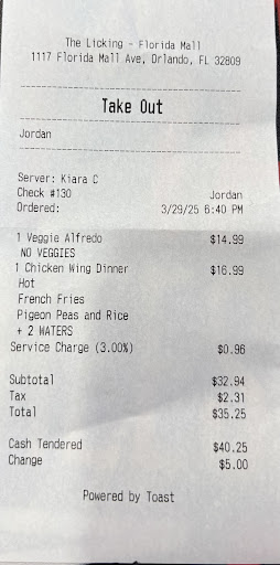 My family and I were visiting Orlando for vacation the week of March 10th - 16th, 2023. We decided to go to the Licking because of the reviews and food options. We went to the one near Millennium Mall but they were too small to accommodate our group of 18. The nice security man told us about the other location and that they were big enough to accommodate us to sit everyone together. The manager also was friendly and told us they could seat us together on the patio but not everyone wanted to sit on the patio. I called the other location and was advised it wouldn't be a problem because they had a room to sit us in but that we would have to wait about 10 -15 minutes. Well, the wait was 30 even after being told 10 - 15 minutes when we arrived. I was told they needed to clean the room and set it up for us. I stopped one of the workers to see what was taking so long. He went to check on it and then came back to get menus so he could seat us. He never said anything to me until he advised us to come on. Instead of giving us the room as previously told twice, we were crammed in a small area where we were on top of each other and literally touching each other. A few were sitting on the corner of the tables meant for 1 person. The food was Amazing. We all agreed the food was 5 stars, but everythng else was less than a 1 star.