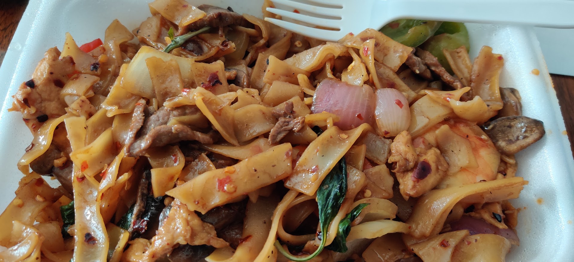 I heard from family about the good food here and was finally able to try it. Ordered the drunken noodles(spice level - hot) for myself and the pineapple fried rice (with chicken, no veggies, no spice) for my wife and saw the order taker write down these notes. After coming home, I started eating right away, and loved my food, and my wife joined me after a bit. On opening her box, she had a mixed reaction of anger/surprise/sadness.. they forgot about the no veggies part.. her pineapple fried rice had carrots, onions, spring onions and cucumbers. They also garnished it with "CASHEW NUTS" and parsley leaves. Fortunately, neither my wife nor I are allergic to nuts. The description didn't mention anything about nuts! It would've been a disaster if someone allergic ordered this.