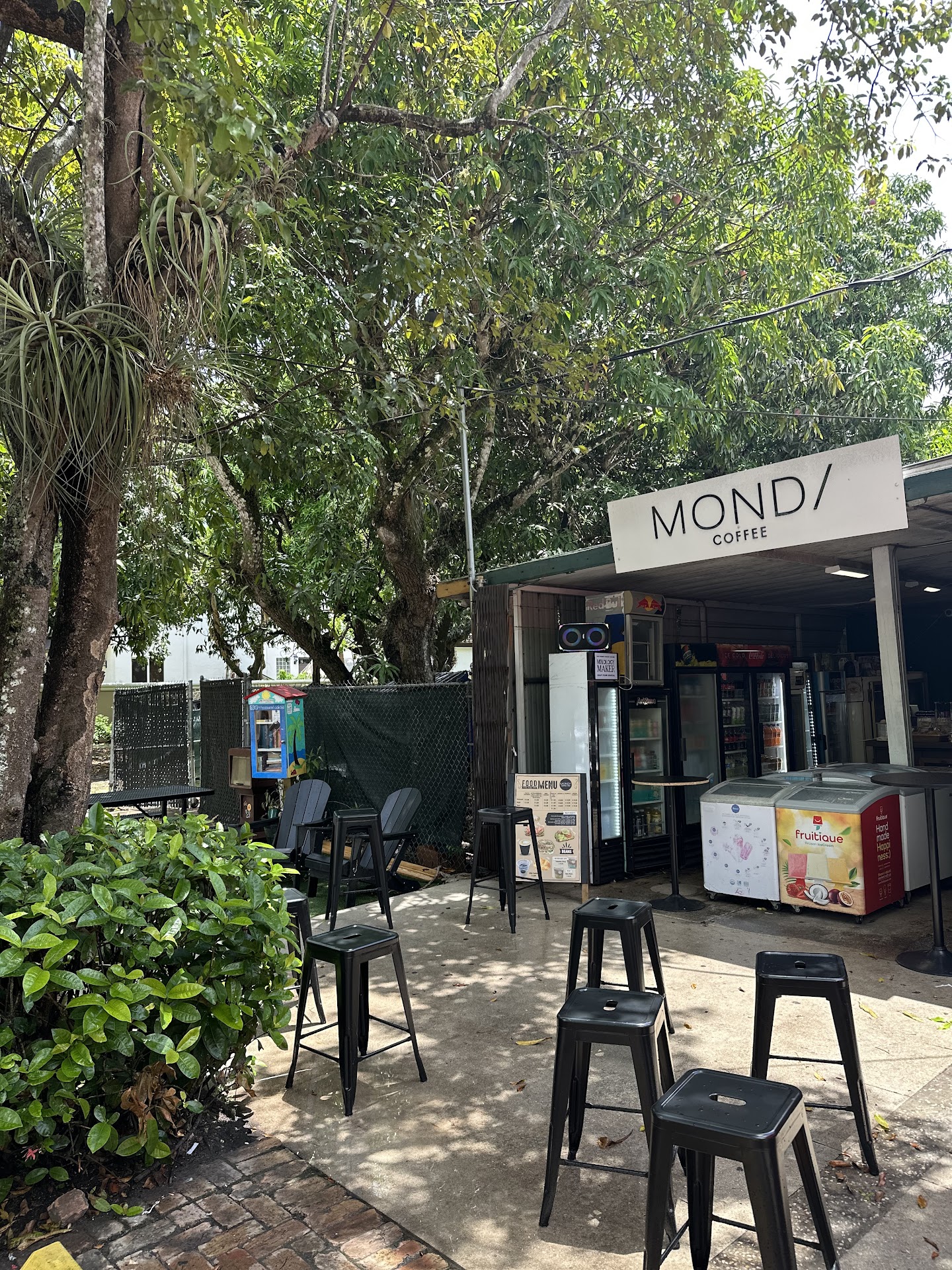 This is such a quaint spot for a coffee shop! It's nestled just beside a fresh food market that sells fruits, sweets, and hot sauce, to name a few. At MONDI I got a cortado and decided to sit by the river just across the street. It's such a relaxing location with ample seating tables under a canopy of trees. The location is rather secluded from other establishments and so the availability of bike parking was a surprising addition. I believe the bike parking is more so for maintaining bikes organized in a small area. This location is fed by a separated multi-use pathway that becomes a designated bike lane as it continues south. Lastly, a cute little library is here, full of great books from and for...