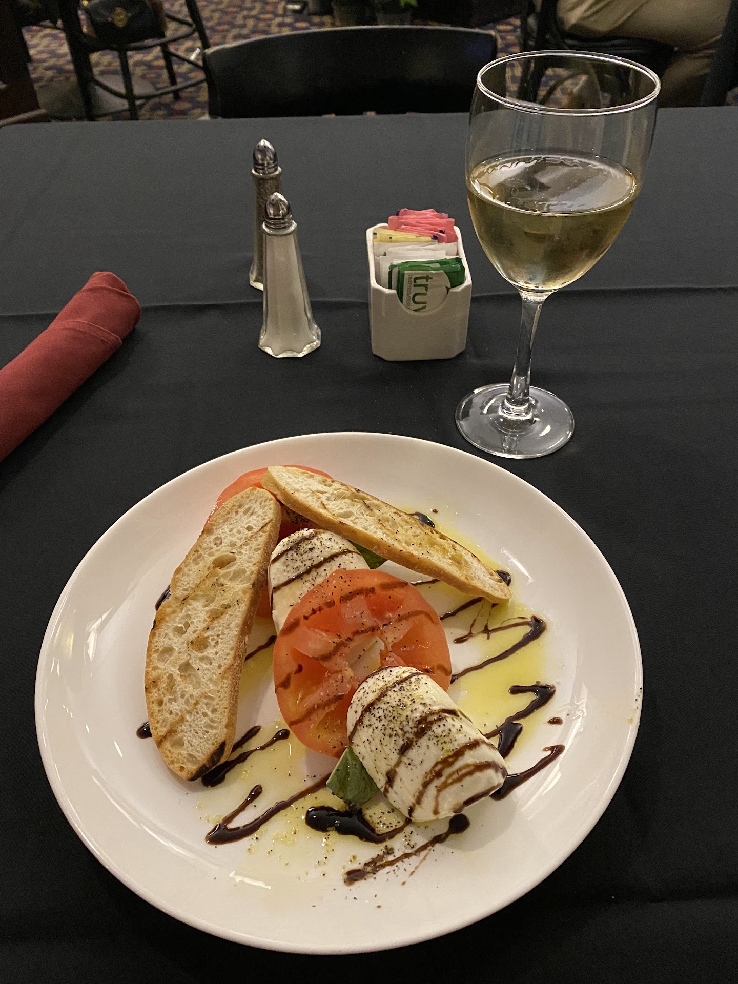 Sandhills Caprese with Fresh Mozzarella, Thick Tomatoes, Basil, Olive Oil and Balsamic and Grilled Crostini.