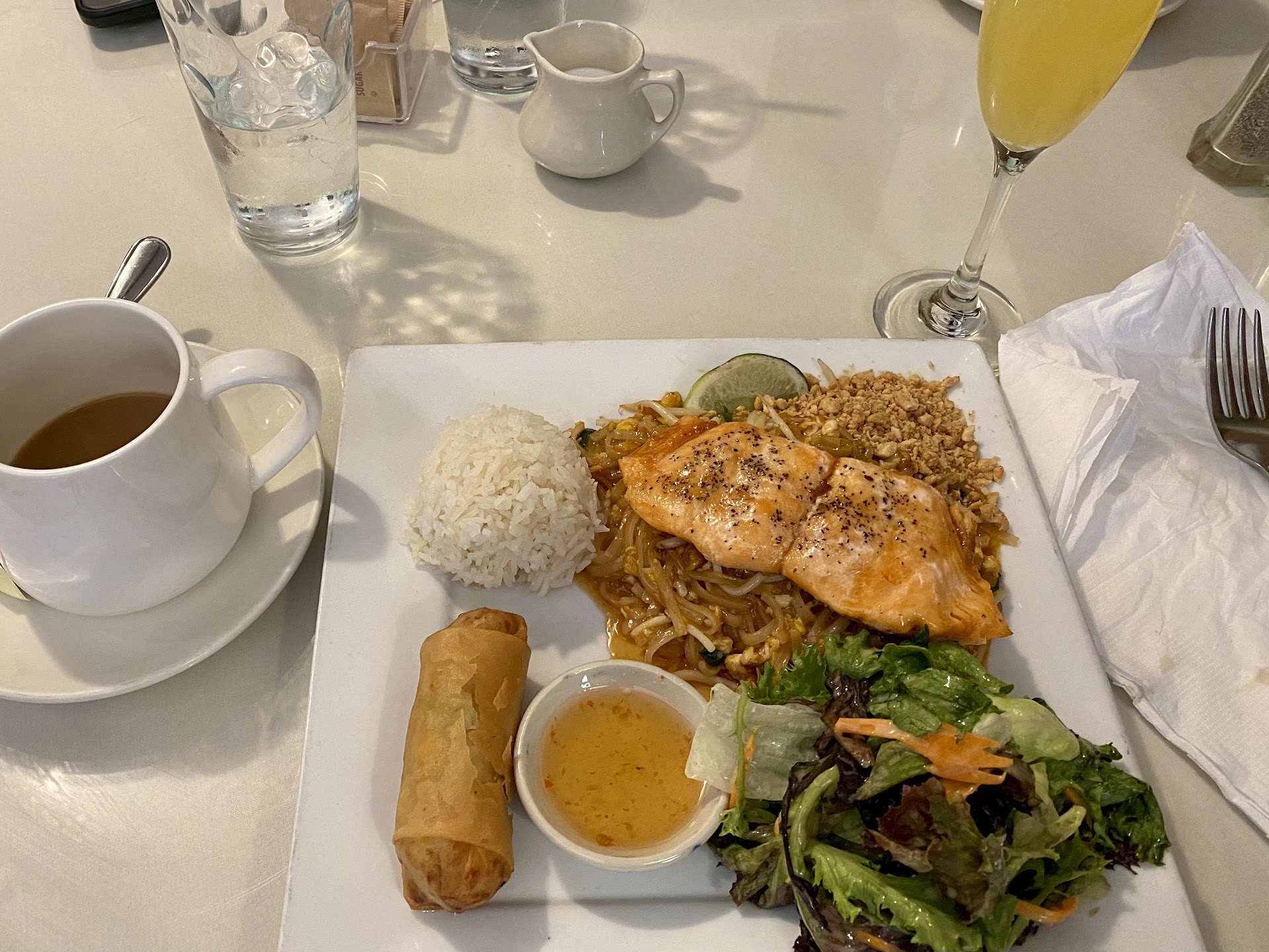 While passing through Pinehurst, this was such a great find! I read some great reviews and was not disappointed. Atmosphere and service were very nice. The restaurant is located on a golf course, so clientele was respectful and pleasant to be around. We ordered the Thai Lunch Special with Soup of the Day (chicken and veggies) and French Onion Soup. Soup of the Day was very savory and delicious, but that French Onion was some of the best! We fought over the last few spoonfuls of soup! Salmon Pad Thai was to die for. The salad was a bit overdressed in my opinion—it ended up making it seem soggier than fresh greens. Nonetheless, dressing was very tasty, so not going to ding them for that. Spring roll and dipping sauce was also top tier, cooked to perfection—light and crunchy on the outside, warm and delicious on the inside. Portion sizes were great. Coffee was yummy. All for a great price! Definitely would go back next time we’re...