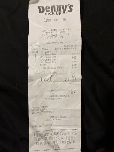 Read moreUpdate January 11, 2024, Unfortunately we've been here way longer than expected. Denny's is the only thing available at night after 11pm so we are forced to use them. We order online, that's a joke because the website is so slow and messed up that it takes 30 to 45 minutes just to place an order for a cheese burger and nachos. The food is good for the most part but that's where it stops. We're always missing something or they are out of stuff but they don't tell you. So when we get back to the room to eat, we have to go back, then we're told they're out. Oh yeah, you never get reimbursed. If there's more than 3 occupied tables, they are freaking out saying "we're swamped" and tell you to come back for your order in another 30 minutes. I don't know how they stay in business. I can't wait to leave Lealman, St. Pete.